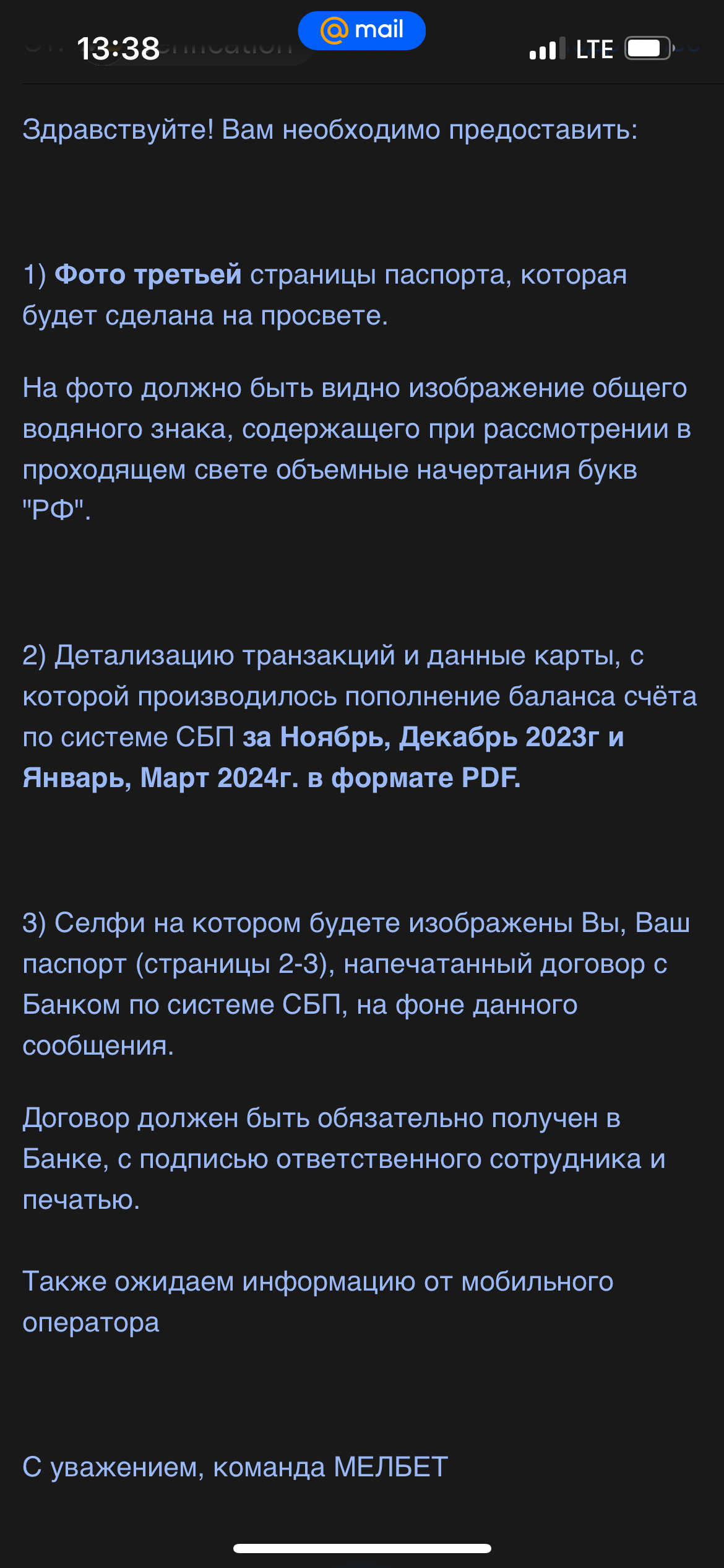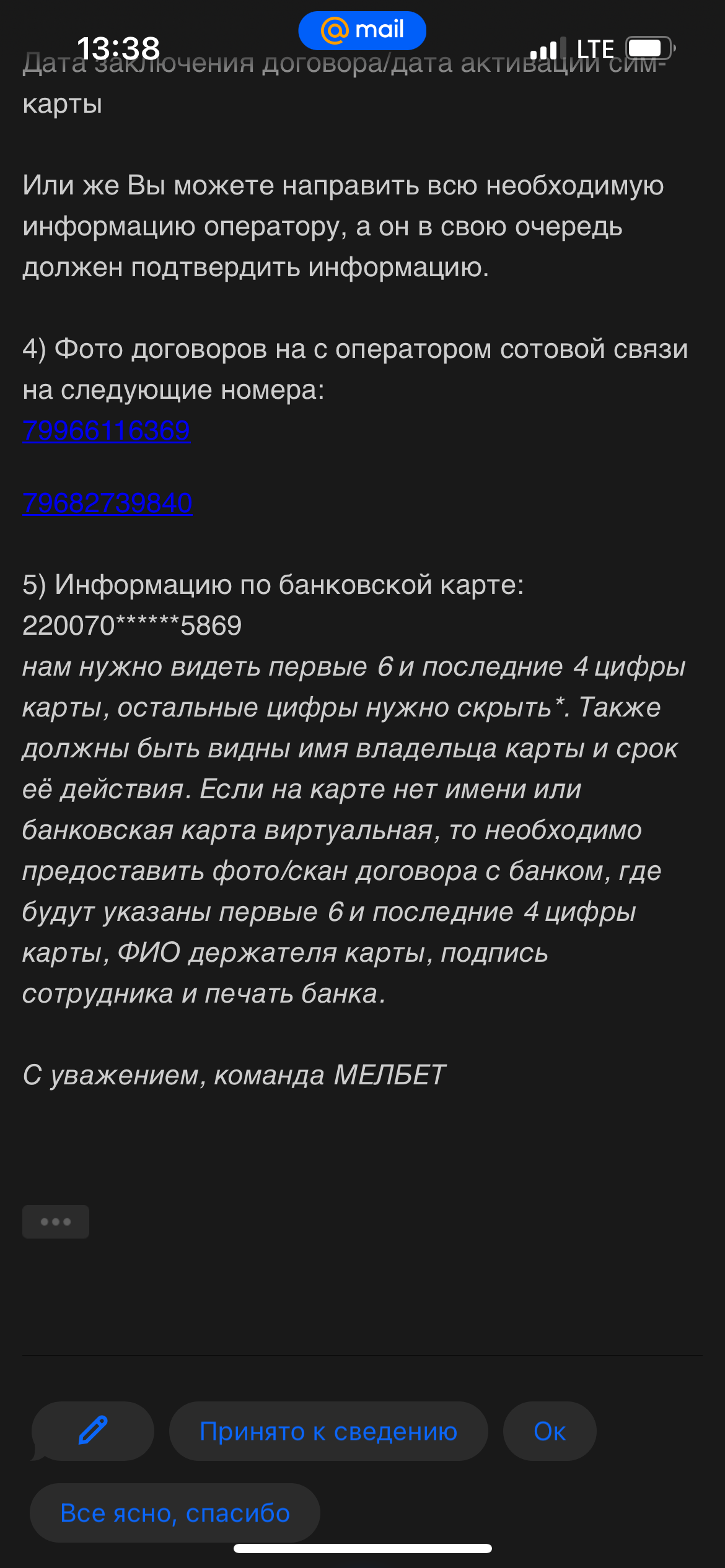 Начал пользоваться Мелбет , сначала проигрыши , потом бан ( классика жанра ) помимо всех отправленых документов ( официальных и заверенных печатью ) , паспорта и селфи требуют еще и выписки и чтобы мой сотовый оператор мне ответил в чате их приложения , что действительно я являюсь владельцем сим карты ( хотя договор я уже предоставил ) и по понятной причине Билайн мне отказал ( конфиденциальность данных ) Борюсь с ними на протяжении месяца , предоставил все необходимые и неоспоримые факты , что я являюсь владельцем данного аккаунта и всех прилагающихся к нему данных , но видеовериф до сих пор не назначен , продолжают задалбывать новыми фото