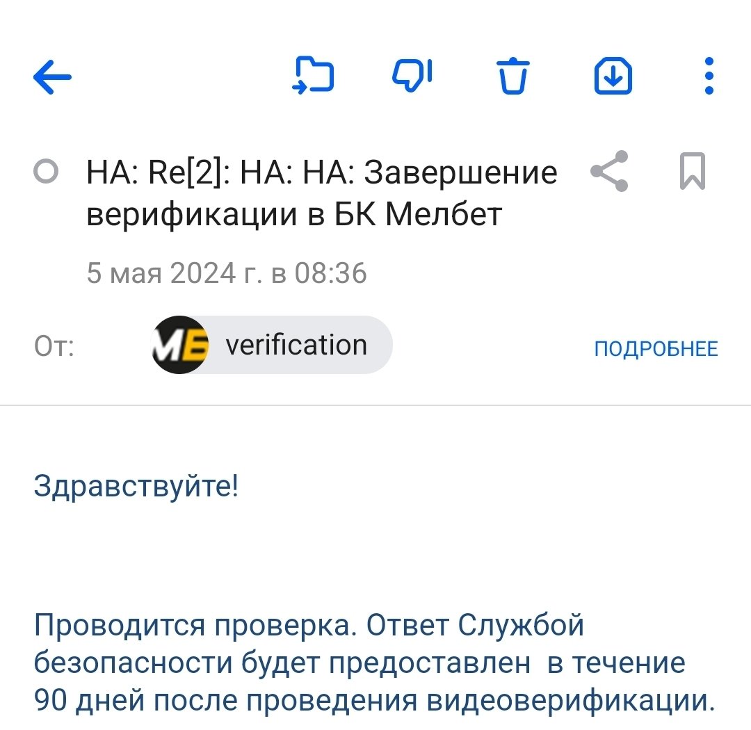 Добрый день. Буемекер заблокировал аккаунт после нескольких удачных ставок и попытки вывести выигрышь. С 30 марта 2024 года букмекерская контора «Мелбет» проводит верификацию, раз в три дня запрашивая фото с различными документами. Вся запрошенная информация направляется букмекеру. Но каждый раз запрашивают новое фото. Это длится уже 16 дней, я понимаю, что они затягивают время. Прошу помощи в решении проблемы.