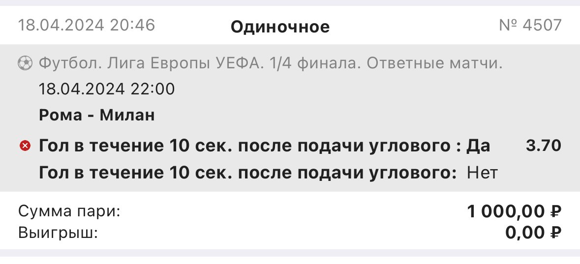 Добрый день! Просьба помочь в проверки корректности расчета пари на Гол в течение 10 сек. после подачи углового в матче ЛЕ между Ромой и Миланом г. На 85-ой минуте гол забил Габбиа после розыгрыша углового удара. Есть ощущение, что после розыгрыша углового, подачи Леао и пересечением мячом линии ворот полных 10 секунд не истекли. Букмекер рассчитал ставку как проигрыш, данных сколько секунд прошло с подачи углового до гола в результате расчета ставки не дает...
