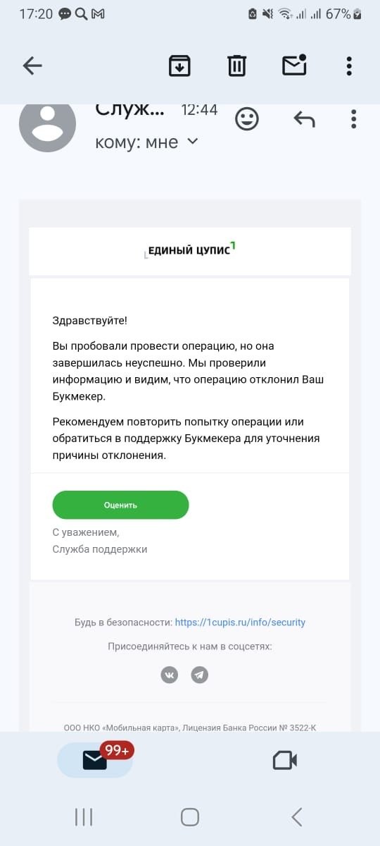 Здравствуйте,номер телефона к которому привязан аккаунт +7 (977) 298-88-14 12 апреля закинул 30000 тыс руб,выиграл 90 тыс и сразу начали запрашивать повторную верификацию и много дополнительных документов,справку из банка,селфи с договором,селфи с последними ставками,я все им отправил и они ответили документы приняты все ок,но вывод возможен только на банковский счет,я сделал запрос на вывод,сказали в течение 10 дней рассмотрение,захожу сегодня проверить и деньги вернули на аккаунт без объяснения причины.Но теперь вывод доступен только на Цупис,жму вывод на цупис и сразу же происходит техническая ошибка,(код ошибки 39)В общем винлайн в последнее время начали обманывать людей,мошенники и это еще не такая большая сумма!Подскажите пожалуйста как можно решить проблему,я ничего не нарушал пополнял со своей карты,ставил со своего аккаунта что им все в повторной верификации подтвердил!Ставил на топовые чемпионаты карточки Тотал меньше