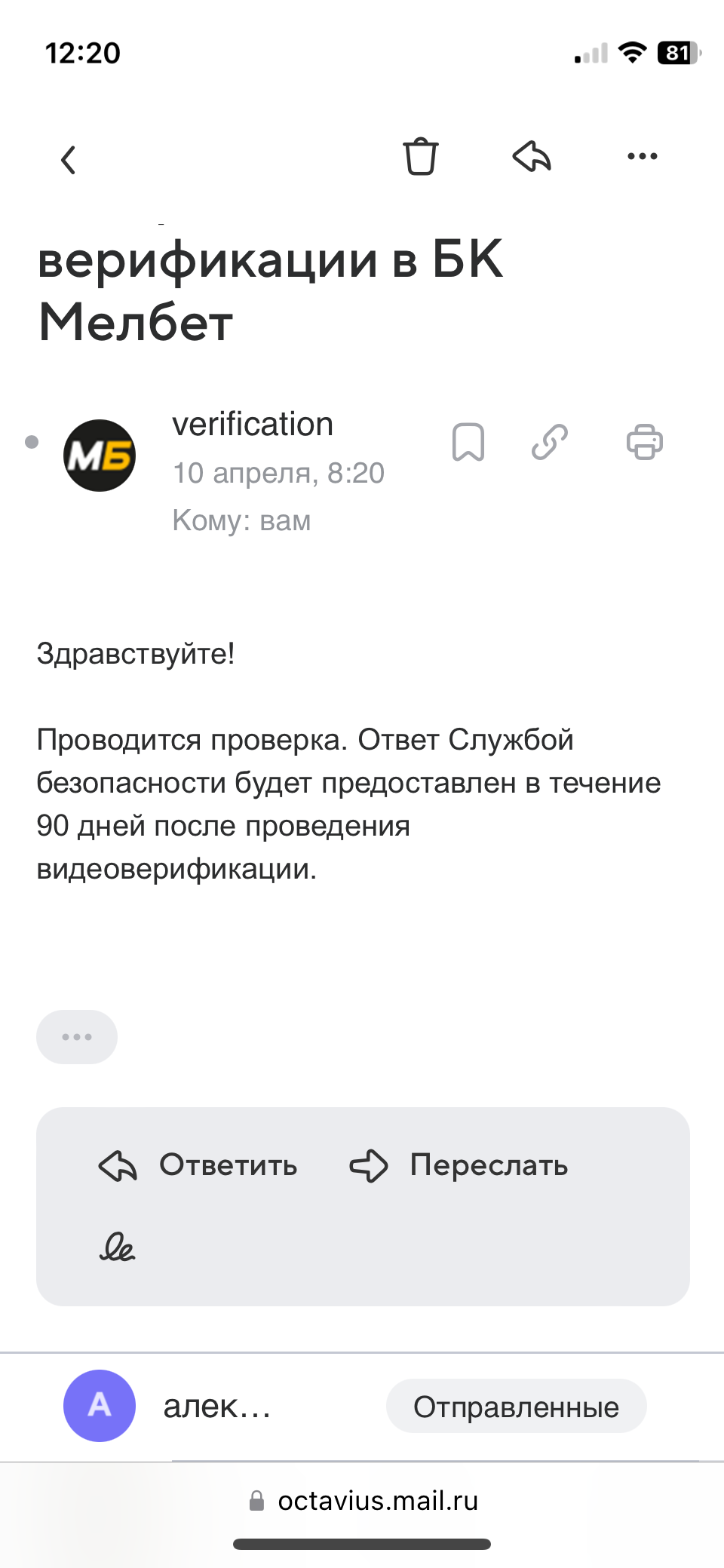 Добрый день , данная контора не выплачивает денежные средства , прошел верификацию все фото от паспорта , фото карты и до квитанций ЖКХ отправил , назначили видеоверификацию прошел на все ответил , получил ответ что до 90 дней заблокирован мой аккаунт на проверку. Помогите решить вопрос данная контора незаконно удерживает мои денежные средства уже очень длительное время так еще и 90 дней добавили после видео. На аккаунте 290+тысяч , очень нуждаюсь в своих деньгах но мелбет не отдает , помогите