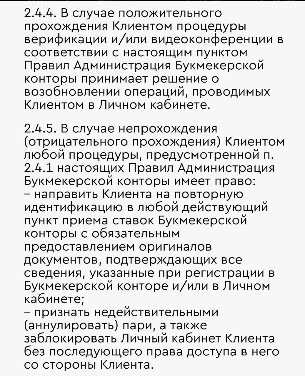Ограничили максимальную сумму ставки 500-1000 рублей, назначили верификацию. Запросили ряд фотографий. Все они были мной предоставлены своевременно и без каких-либо проблем.В течение недели после загразки последней фотографии мне сообщили, что необходимо явиться в ППС в городе Москва, время работы каждый четверг с 16 до 17 часов.Я ответил, что живу в Тюмени, на что сотрудники конторы мне сказали, что процедура проводится в моём личном присутствии, и сроки явки неограничены. Я решил перепроверить, что сказано на этот счёт в правилах.В пункте 2.4.5 по поводу процедуры верификации сказано, что контора имеет право направить клиента в ЛЮБОЙ действующий пункт приёма ставок в случае НЕПРОХОЖДЕНИЯ (отрицательного прохождения) клиентом любой процедуры, предусмотренной пунктом 2.4.1. Пункт 2.4.1 гласит, что "Администрация Букмекерской конторы при любых подозрительных действиях Клиента, а также в целях обеспечения безопасности проводимых операций Клиентами имеет право произвести процедуру верификации и затребовать любые сведения и дополнительные документы, подтверждающие все данные Клиента"Все запрошенные документы были мной предоставлены.Также в пункте 2.4.1 сказано, что "В целях верификации Администрация Букмекерской конторы имеет право провести с Клиентом видеоконференцию. В ходе видеоконференции Клиенту будут заданы вопросы, позволяющие установить достоверность предоставленных им ранее сведений, а также вопросы, ответы на которые позволят установить факт совершения ставок и заключения пари данным Клиентом". Для моего аккаунта НЕ БЫЛО назначено и не было проведено никакой видеоконференции, предусмотренной пунктом 2.4.1.Также, на основании пункта 2.4.5 нет никаких оснований утверждать, что любая процедура, предусмотренная пунктом 2.4.1, была НЕ ПРОЙДЕНА (отрицательно пройдена), вследствие чего могла быть назначена идентификация в пункте приёма ставок, т.к. каждое фото, в том числе фотография номера карты были загружены и проверены букмекером. Более того, прописанный в правилах "ЛЮБОЙ действующий пункт приёма ставок" противоречит тому, что меня отправляют в КОНКРЕТНЫЙ пункт приёма ставок в Москве.Из всего вышесказанного делаю вывод, что букмекер нарушает свои же правила и злоупотребляет полномочиями, выставляя заведомо невыполнимые условия верификации, не предусмотренные их собственными правилами.