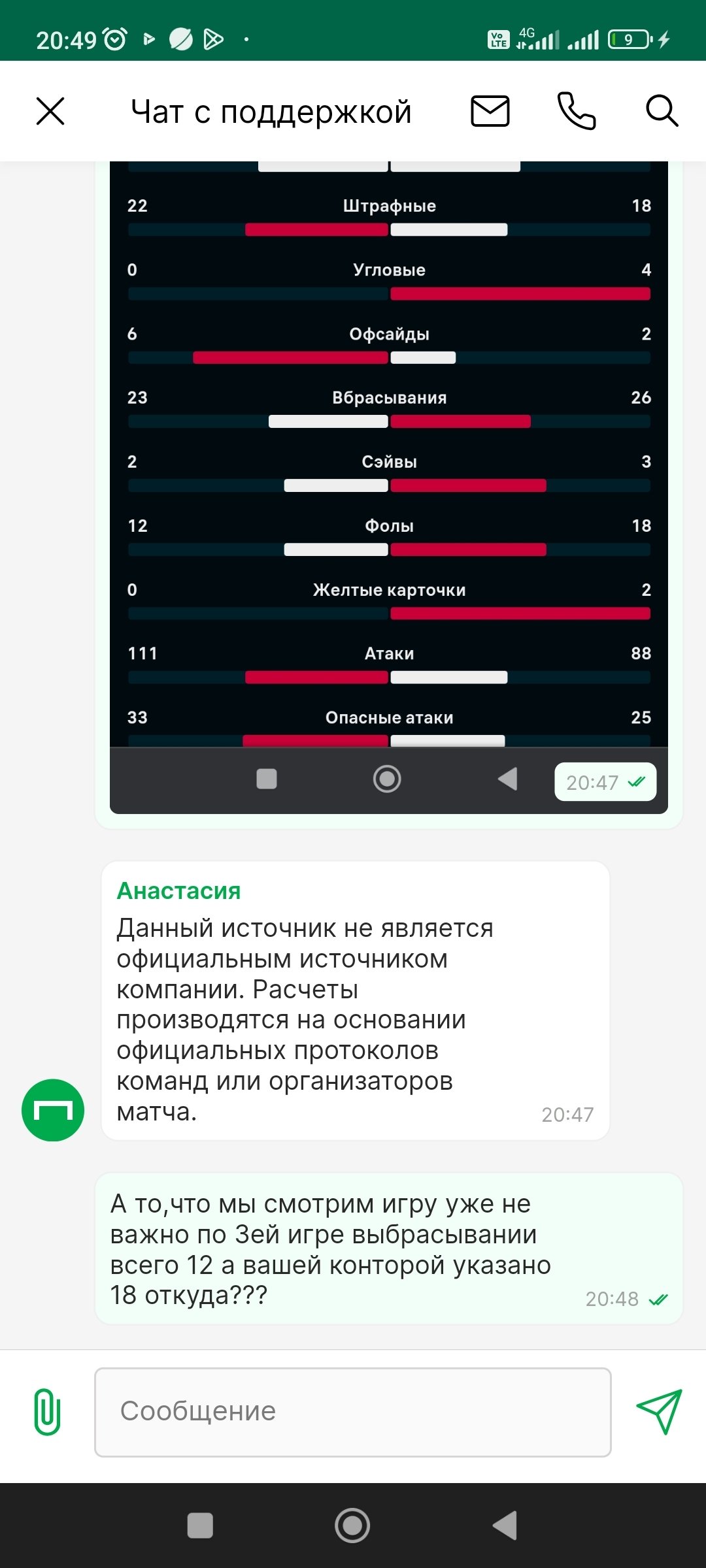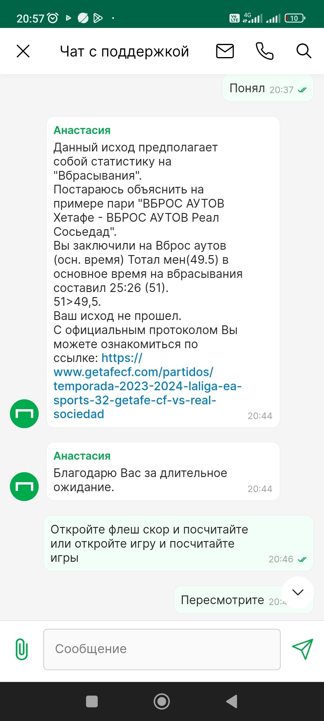 были поставлены 3 ставки 2 на игру Хетафе-Реал Сосьедад по 15000 на вброс аутов тотал меньше 49,5 за игру общей суммой 30000.И одна ставка на игру Вброс Аутов Торино-Фрозиноне Инд т.м команды 1. 16.5 вброс аутов .В итоге после просмотра игры было полное не понимание счёт отличался от фактического происходящего по трансляции смотрел на сайте букмекера, букмекер отнекивается ,что счёт по первой игре 51вбрасывание а по второй игре вообще 18.Просил их пересмотреть игру букмекер упёрся и не хочет слушать доводы ,хотя лично видел игру считал ауты это не сложно можно пересмотреть игры в первой игре 49вбрасывании,во второй вообще 12 результаты подтверждены на сайтах флеш скор ,дата результат,чемпионат да и дело не в саитах эту игру не сложно просмотреть и посчитать , судя по просмотренному ещё раз видео они актуальны прошу посодействовать и повлиять на решение букмекера иначе это не в какие ворота не лезет как будто букмекер ,что хочет то и творит.Прилагаю скрины да и вообще всем кто смотрим убедится самим и проверить счёт выбрасывании инет в помощ,заранее спасибо ,скриншоты прилагаю к жалобе