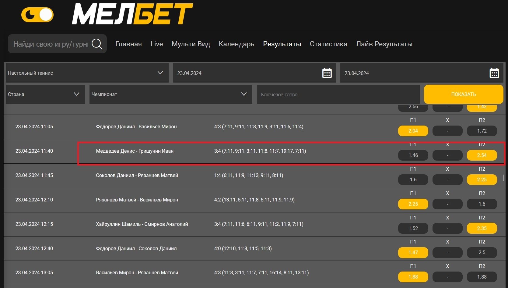 Здравствуйте. Поставит ставку на 6-ую партию настольного тенниса 23 апреля на п2 гришунина против медведева, победа 2 сыграла, только когда зашел на счет бк проверить выигрыш, обнаружил, что ставка проиграна якобы, потому что бк мелбет просто поменял людей местами, п2 оказался гришунин, а не медведев, что было при заключении пари, а в расчете мой игрок на которого ставил уже был написан первым. Прошу помощи и разобраться