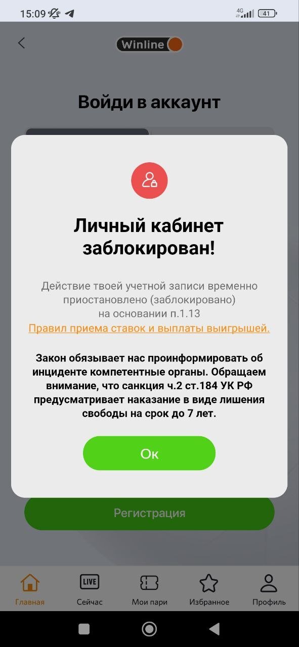 По информации от букмекера, на текущий момент проводится проверка по соблюдению правил Честной игры. Аккаунт заблокирован на срок до 1 года, согласно п.п. 1.13. Подробной информации, аргументирующей причины блокировки аккаунта, букмекером не предоставлено.