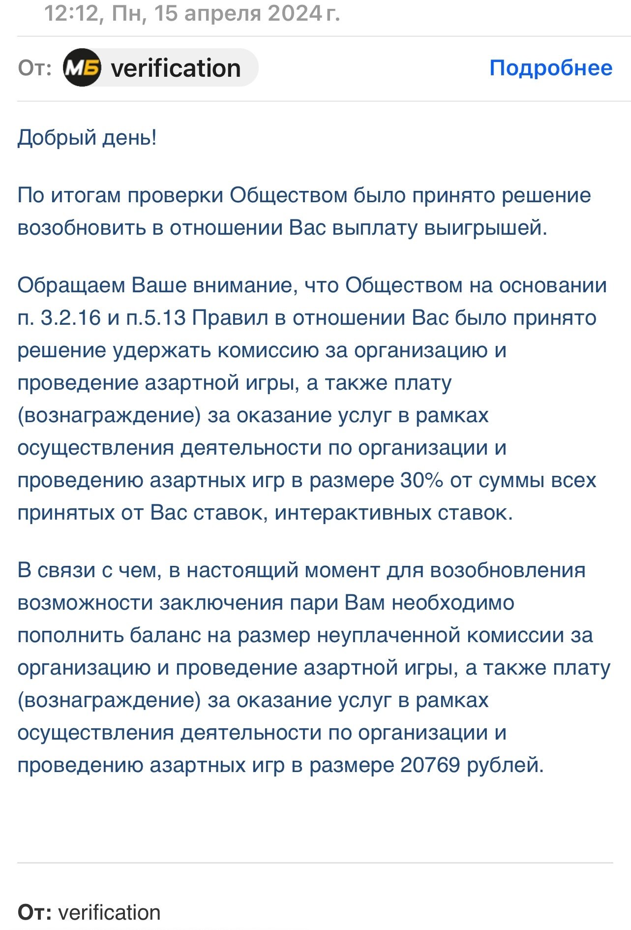 Имею акк в этой конторе несколько лет,активно начал играть месяца 3-4 назадВ один прекрасный день проставил несколько ставок на тысяч 20+,в итоге доступ к акку закрыли,назначили вериф,даже игры не успели начаться,на которые ставил))не прогрузы,не какие нибудь договорняки,брал статистику хоккея плюс бигмаркеты иногда.После отправки всех доков,во всех позах и тд и тп была видеоверификация,грузили минут 20 по всем видам спорта,ну да ладно,это все стандартно ,в основном.Прошло 2 мес будто бы проверки и приходит значит мне письмо от этой ,даже незнаю как назвать конторки.Содержимое письма :Обращаем Ваше внимание, что Обществом на основании п. и п Правил в отношении Вас было принято решение удержать комиссию за организацию и проведение азартной игры, а также плату (вознаграждение) за оказание услуг в рамках осуществления деятельности по организации и проведению азартных игр в размере 30% от суммы всех принятых от Вас ставок, интерактивных ставокПомимо того что с баланса сперли около 30 тыс,так я еще им должен 20700!!!)))))типа плати и продолжай ставить))))))Я в шоке честно говоря.