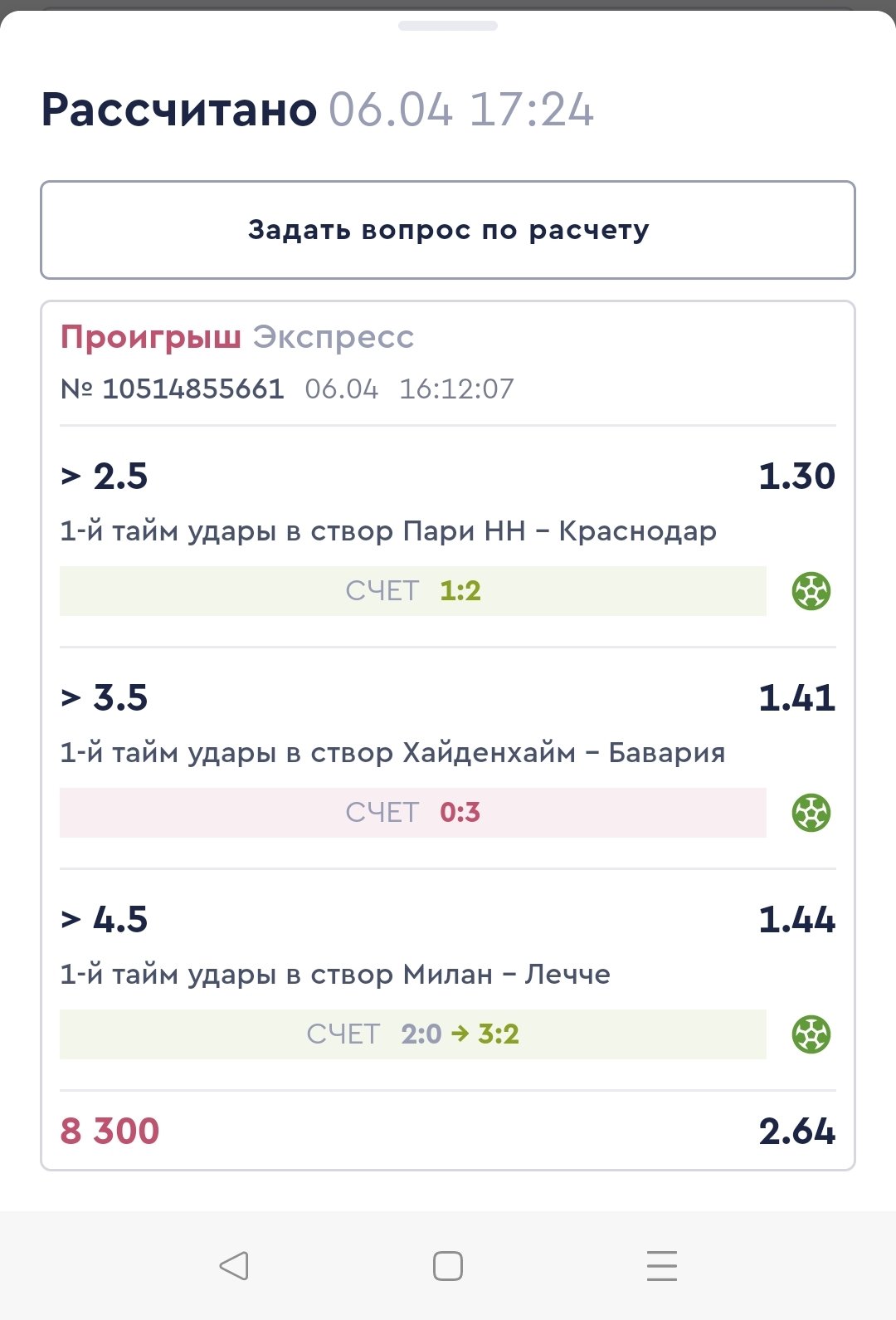 Составил экспресс из 3 событий. Ставил на удары в створ. Все события зашли. Открыв купон, я увидел неверный расчет. Пари было рассчитано как проигравшие. Фонбет посчитал в матче Хайденхайма и Баварии в первом тайме 3 удара в свор. Хотя официальный сайт Бундеслиги насчитал 4 удара. Согласно нему счет по ударам в створ в первом тайме 0:4 в пользу Баварии.