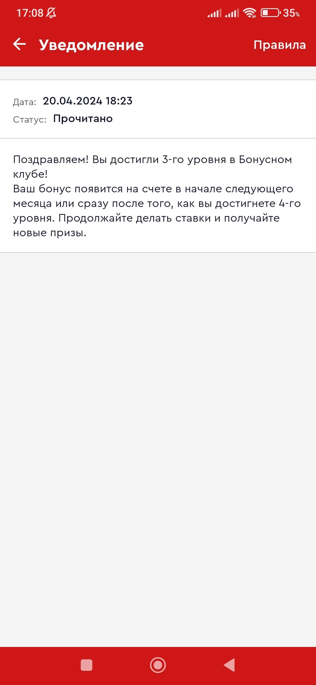 Вот именно, что нарушений правил не было, честным путем достиг 3 уровня, заработал 2 тыс. руб бонусом и сразу отключили) я посмотрел, что это не единственная жалоба, что может говорить только о мошенничестве со стороны легальной БК!