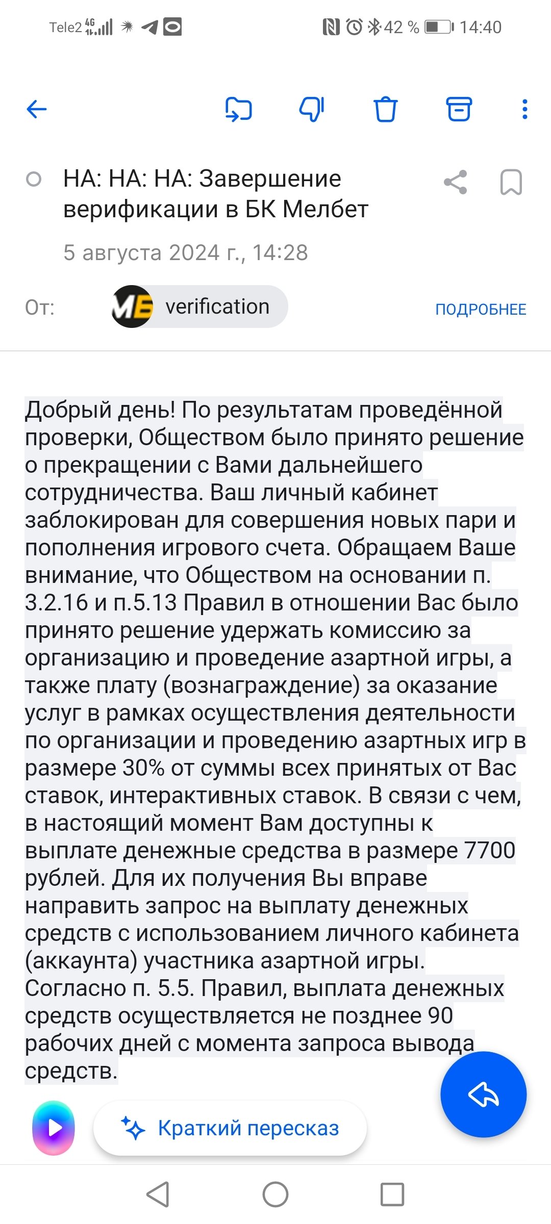 Мне закрыли доступ в аккаунт в мэлбэте. Стали проходить верификацию. Она уже длится месяц точно. Пополнял через 2 карты разные, на маму и жену. По запросу отправлял им нужные документы, даже свидетельство о рождении, что я сын мамы. Даже оплату жкх за последние 3 месяца. Я уже устал. У меня там деньги мои. Они опять запросили договор на определённую карту, из банка. Я им это отправлял в формате pdf. Я уже все что можно им отправил. Надоело.