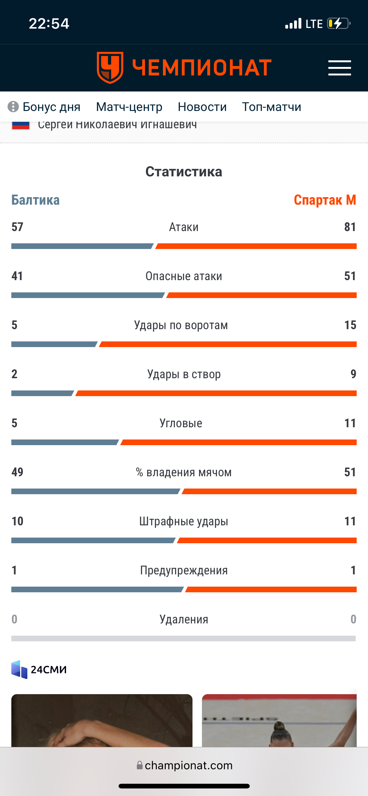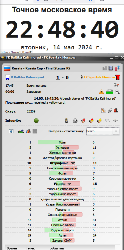 Сделал экспресс ставку из 5 событий, все выиграли кроме одного, а именно ставка на количество общих ударов в кубковом матче Балтика - Спартак. Я поставил на тотал меньше 23.5, во всех официальных источниках, таких как championat.ru, soccer365.ru, Flashscore статистика этого матча 20 общих ударов, Фонбет в ответ на мое обращение сообщил, что они пользуются статистикой, которую им предоставил RunningBall и предоставили скриншот, но хочу взять также во внимание, что даже здесь они обманывают, потому что по статистике RunningBall было нанесено 24 удара, тогда как Фонбет при расчете моего экспресса указал, что было 25 ударов. Да, согласно пункту 4.4 правил они могут использовать источник, который они сами выберут, но где тогда правда, если даже их кривой источник указал, что было 24 удара, а они рассчитывают как 25, получается они могут сами определять результат любого события? и где логика, как может быть настолько разная статистка от официальных Российских источников в 5 ударов? А ведь это официальный спонсор сборной России по футболу, который получается ворует честно выигранные деньги. Скриншоты прилагаю.