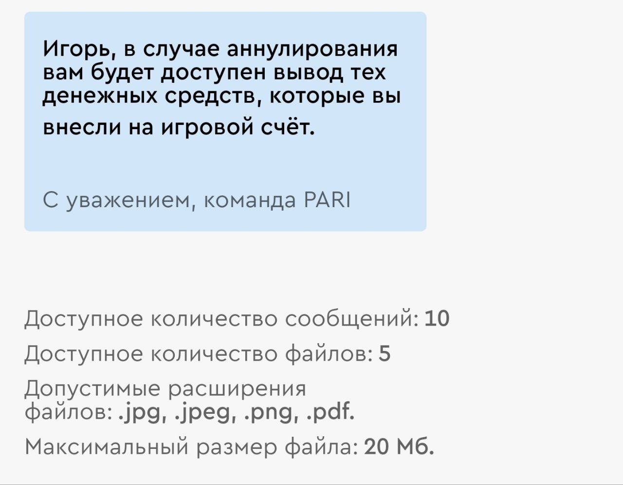 Я пользователь "БК Пари", активно делал ставки в этой букмекерской конторе (онлайн через сайт и через приложение). В один момент она заблокировала мне вывод средств (199300 рублей), попросив предоставить необходимые документы для повторной идентификации. После того как я им всё отправил, мне написали, что мне нужно явиться в ППС в г. Москва. Проживаю я далеко не в Москве и даже не в РФ (в гос-ве Израиль), поэтому была попытка уговорить их проявить снисхождение и заменить способ верификации, но, в итоге, мне было отказано. Мне было сказано: либо приезжайте в ППС г. Москва, либо, если отказываетесь, то пишите заявление об аннуляции (перерасчете с коэффициентом 1, где все ставки аннулируют и возвращают только депозиты). Проиграл я у них больше, чем выиграл, лететь через почти полмира в Москву ради верификации в ППС я тоже не захотел, поэтому я решился написать это заявление, которое они мне сами и предложили написать. В заявлении я писал (по их же образцу): "Прошу рассчитать результаты всех моих пари с начала регистрации с коэффициентом 1, привести баланс моего игрового счета в соответствии с таким расчетом результатов пари:- Заблокировать возможность распоряжение моим игровым счетом, при условии предоставления мне возможности в срок не ранее 7 и не позднее 21 дня получить выигрыш в случае его наличия;- При достижении баланса игрового счета равного нулю, полностью заблокировать возможность использования моего игрового счета для участия в азартных играх (включая внесение интерактивных ставок, заключение пари и получение выигрышей)." Отправил им заявление, сидел ждал, проверяя каждый день сумму баланса на счете. Она не менялась. Прошла ровно неделя с момента как я им всё отправил и я решил зайти во вкладку вывода и вижу, что у меня доступен вывод на ЕЦУПИС по 1000 рублей в сутки, сумма на балансе такая же. То есть, получается, заявление они приняли, но сделали всё-равно по своему, наплевав как и на свои правила, как и на само мое заявление. Ни "перерасчета с коэффициентом 1" (в моем случае это увеличение моего баланса на счете, так как ставки признаются недействительными, а депозиты возвращаются), ни "вывода баланса не раньше 7 дней, не позднее 21 дня" не произошло. Спасибо, конечно, что мне открыли вывод, но мои средства мне, в итоге, выводить как минимум 200 дней! И это учитывая, что я проиграл у них по сумме всех ставок больше полумиллиона! Если бы у меня было больше выигранных денег, я уверен, они бы уже давно бы обнулили мне баланс на счете. Писал им в запросы с претензией почему вы не выполнили свои обязательства, что были перечислены в образце их же заявления, на что получал какую-то стандартную отписку "Вам доступен вывод по 1000 рублей в сутки на ЕЦУПИС, с правилами вы можете ознакомиться..." и "С нашей стороны все действия были произведены", хотя ничего подобного не произошло. Ничего не остается как писать жалобу тут. Прошу "БК ПАРИ" выполнить свои же пункты правил, перерасчитать все мои ставки с коэффициентом 1, вернуть мне депозиты и дать вывести мои денежные средства со счета не позднее 21 дня! Переписку в запросах и фото заявления, написанного руки, прилагаю.