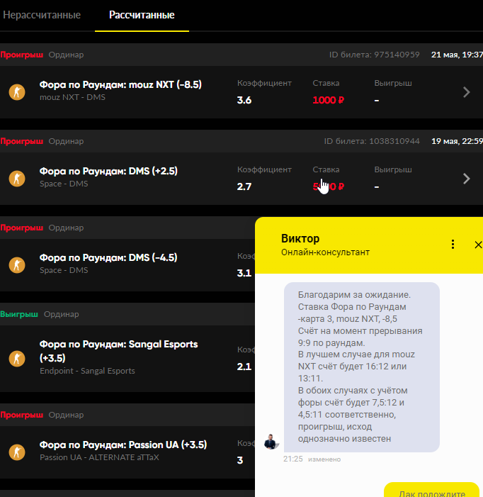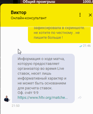 Ставлю тут только на CS. Все хорошо ставлю разные суммы до 10 000рублей это мое хобби. Сегодня сделала ставку всего 1000рублей. Матч на счете 9-9 остановился, да я понимаю что ставка по сути проиграла, но у них есть пункт о том что в случае дисквалификации есть возврат. тем более что счет стал 0-13 это отображается у них на сайте. а я ставила на фору 2 команды минус 8.5 . я же не прошу мне сделать выигрыш. Я писала им в чат где наверное идиот сидит и копирует мне часть правил специально вырезая пункты о возврате. я повторюсь я читала их правила. Взбесило то что они на ровном месте обманывают тем более сумма то 1000 рублей учитывая то что я и 5000 и больше проигрывала у них. Помогите сделать возврат и наказать бестолковых сотрудников. Все скриншоты как ответов сотрудника в чате так и счета и ставки у меня есть готова предоставить