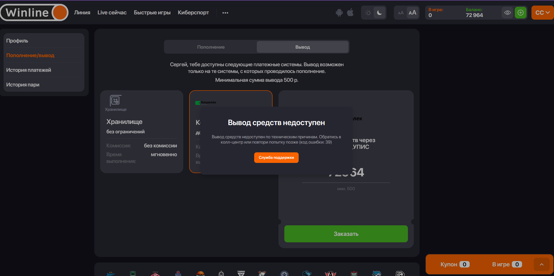 Давно ставлю в Винлайн до этого момента проблем не было, но в один прекрасный день мой счет был порезан, ну думаю ладно! Захотел вывести деньги но не тут то было, изначально вывод был только один это банковский счет, запросил вывод, букмекер начал требовать документы, все документы отправил какие требовал букмекер , говорят ждите! Проходит два дня букмекер отменяет выплату и меняет вывод денежных средств на кошелек ципус , пробую вывести , вылетает ошибка 39 , Вывод средств недоступен по техническим причинам. Обратись в колл-центр или повтори попытку позже (код ошибки: 39) , позвонил в службу поддержки там говорят ждите мы все исправим! По итогу получилось поставить на вывод только две тысячи рублей и они висят до сих пор, говорят ждите 10 дней хотя ранее на кошелек выводили мгновенно! Помогите решить проблему, заранее благодарен!