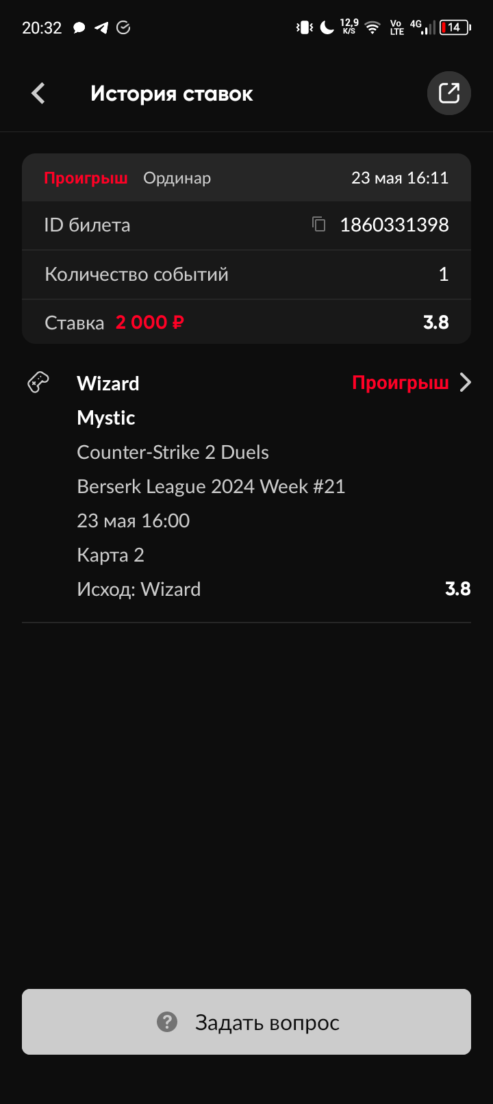 Ставил раньше не задумываясь , но сегодня узнал много интересного про эту лигу.В Лиге 60% матчей - Это договорные матчи. У игроков нету призовых, у всех одинаковые зарплаты. Турнир спонсируется Pariwin . Играют на колл от Админов, А турнир базируется в Киеве. Зарплаты у игроков за три Бо3 - 34$. Как лига которая страна которой враждует , врет около 10 лет , может обещать честную игру ?В разделах любых спортивных событий указывается страна , нигде нет Украины и их матчей , но именно в CS Duels это лига без подписи страны.Я не доверяю украинским лигам , и если бы я знал , то никогда бы ничего не ставил на эти матчи. Я требую возврата денежных средств , в лиге много приколов походу матча , когда игроки между собой общаются без звука, когда один игрок начинает просто стрелять по коробкам дабы выдать своё местоположение, когда. игрок много раз нацелился и не стрелял специально а типо случайно прыгнул.Я нашел человека , который связан с этой лигой , у него около 150+ ставок все идут с выигрышем подряд , ни одного поражения , и все это на этой лиге Berserk CS duels Видео с выигрышными ставками человека в сообщении здесь прикрепить не могу , оставлю ссылку на Ютуб Сумма претензии не 2000, а намного больше