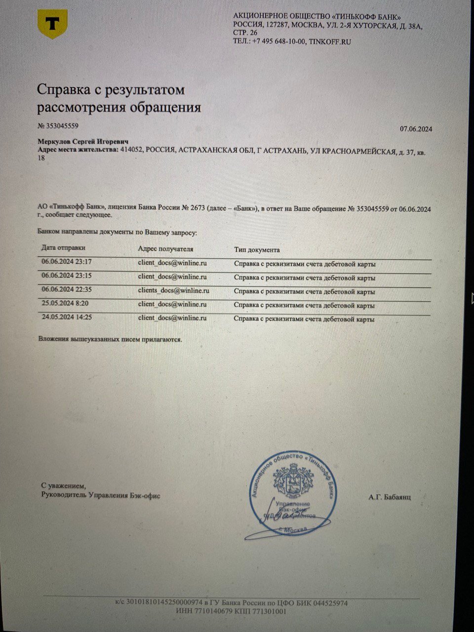 Вначале хочу сообщить, что вижу эту Проблему у Многих пользователей WinLine. Делаю вывод, что такие вещи стали для этой БК нормой, они системны. (это очень печально).Зарегистрирован в Winline уже давно (больше 2 лет назад), периодически ставил - проигрывал, как обычно это бывает. В том месяце (мае) успешно начал играть, довел свой счет до 38685 рублей. Нажимаю на "Вывод средств", и тут начались проблемы. Пошла череда запроса документов: 1) Видеоверификация. Показ - фиксация паспорта и платежной карты. Успешно пройдено.2) Запрос Страницы регистрации в паспорте и Документ с печатью от сотового оператора (приняли с 3 раза)3) Банковские реквизиты с приложения Тинькофф с печатью.Проверка должна занять 5 рабочих дней. Идет 8 день, никакого ответа я не получаю. В чате оператора мне не выводят, на мои звонки уже перестали отвечать.Действия WinLine являются неприемлимыми и необоснованными для Легальной БК работающей на территории РФ. Данная БК нарушает законы РФ о честной и легальной игре!Хочу чтобы legalbet сделал все необходимое, чтобы честно заработанные средства я смог спокойно вывести. Со своей стороны готов предоставить любые документы и пройти любые верификации. Так же сообщаю, что играю в 5 других легальных БК, во всех остальных я Успешно прошел все проверки и вывожу свои деньги!