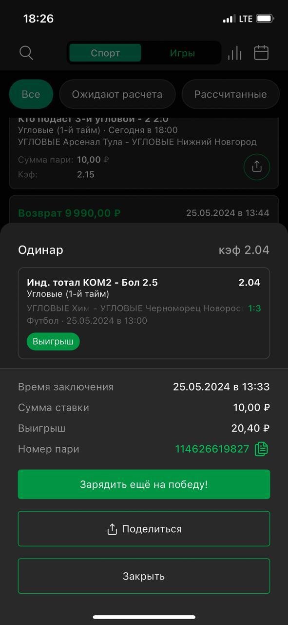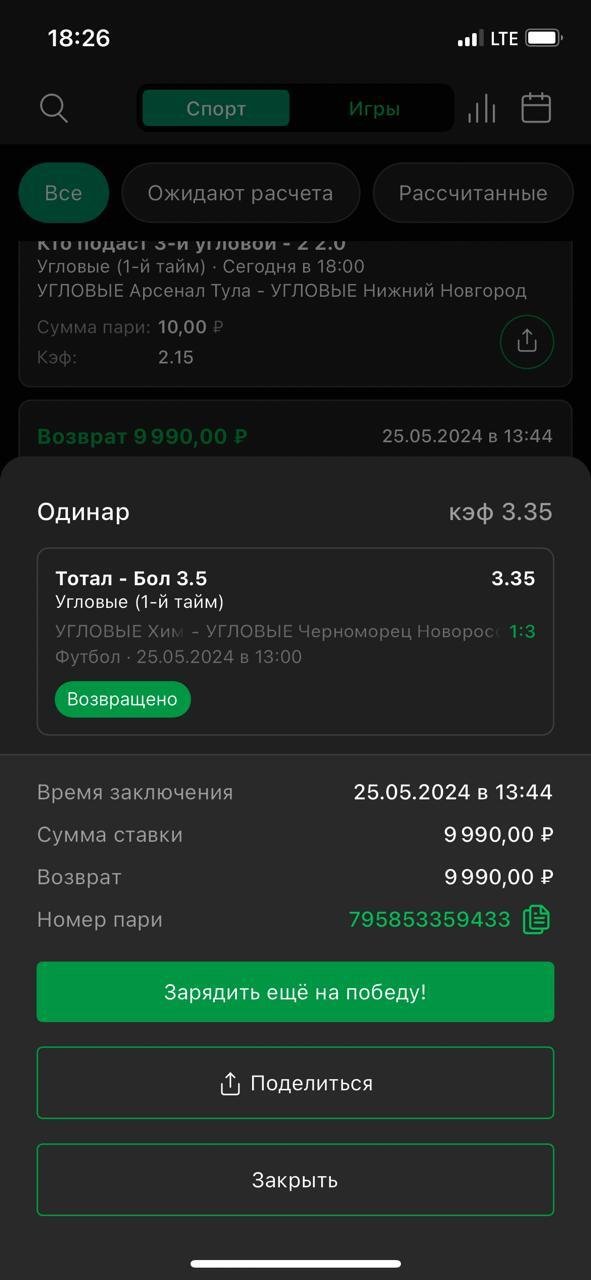 Добрый день, года в букмекерской компании Лига ставок (ОБЩЕСТВО С ОГРАНИЧЕННОЙ ОТВЕТСТВЕННОСТЬЮ "ПЕРВАЯ МЕЖДУНАРОДНАЯ БУКМЕКЕРСКАЯ КОМПАНИЯ" (ООО "ПМБК"), через приложение я заключила пари №114626619827 в режиме live на футбольный матч между ФК Химки и ФК Черноморец. Заключенное мною пари было на то, что индивидуальный тотал угловых Ком2 больше 2,5 в первом тайме (на момент заключения пари было подано Ком2 – два угловых и Ком1 -1 угловой), сумма пари составляла 10 рублей коэффициент 2,04, вскоре я осознала, что поставила вместо 10 000 рублей всего 10 рублей, и вновь заключила подобное пари №795853359433 уже на 9 990 руб. на то, что уже общий тотал угловых в первом тайме будет больше 3,5 (на момент заключения было подано 3 угловых), коэффициент 3,35. После окончания первого тайма оба пари были рассчитаны. Пари №114626619827 как выигрышное, пари №795853359433 с возвратом, и через 10 минут аккаунт был заблокирован. Я попыталась связаться со службой поддержки по указанному в приложении номеру, но трубку никто не брал. Мне пришлось ехать в клуб букмекерской конторы по адресу г. Мытищи, Шараповский пр. 3А. В клубе я составила обращение с просьбой о разблокировке аккаунта и пересчете пари №795853359433. аккаунт разблокировали, но пересчета пари не произошло. Объяснения представители компании давать отказались. Фото заключенных пари прилагаю. Фото с главной страницы приложения также прилагаю. Прошу Вас о помощи в данной ситуации для корректного расчета пари №795853359433.
