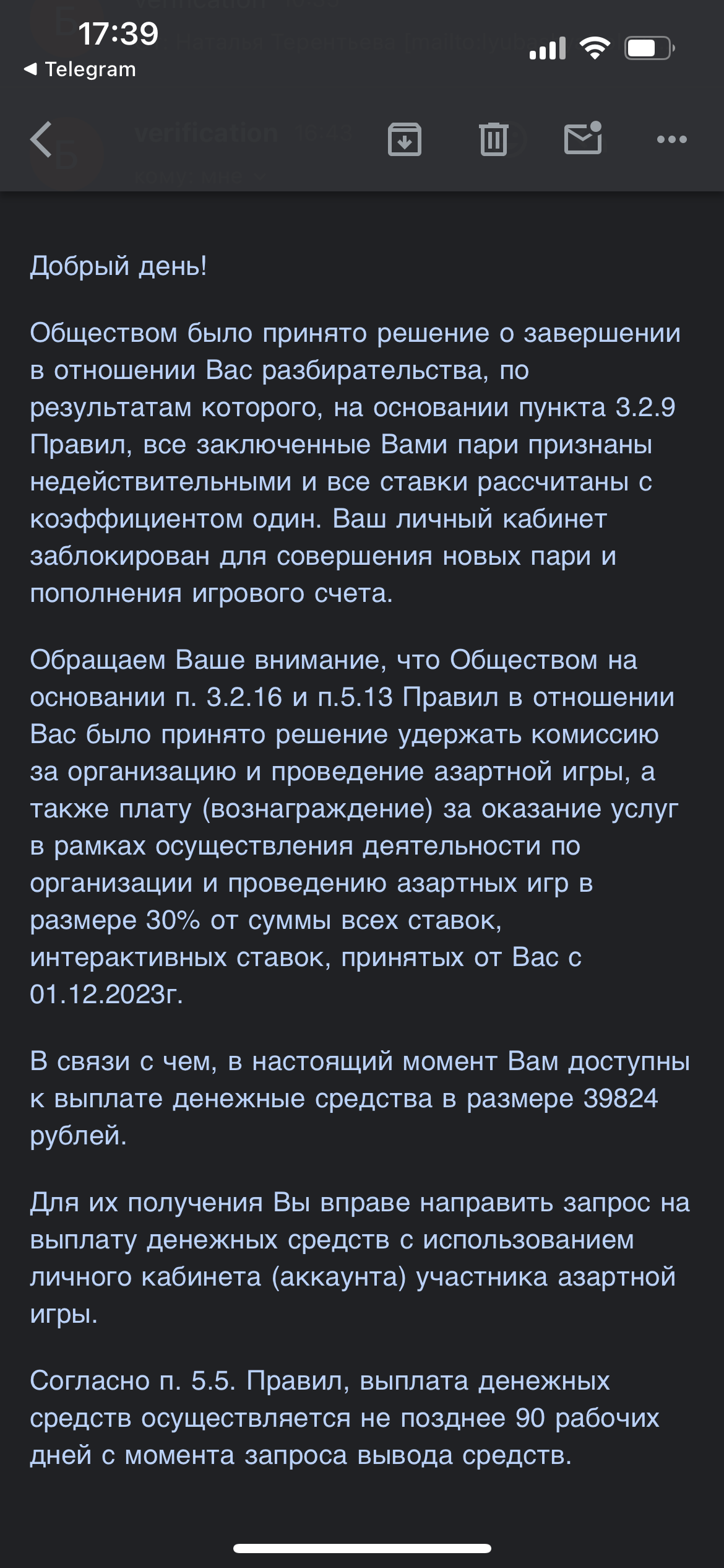 Арбитраж Легалбет получил комментарии и разъяснения от букмекера. Счет закрыт, а выигрыш аннулирован по решению СБ за нарушение правил – мультиаккаунт. Действия БК в рамках правил.