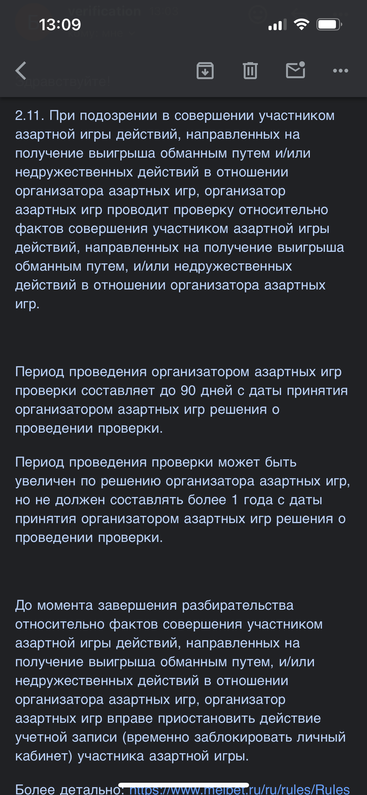 2 месяца проходила у Мелбет верификацию, куча заданий, подробного пояснения к которым они не давали ни в какую, поэтому еле разобралась, что им от меня надо. Позже стали добавляться новые задания: что-то по ЖКХ, скинуть договор с арендодателем кв, которую я снимаю, ЧТООООО?? Я им написала, что изначально этого в условиях для прохождения верификации не было, с какого ***** я должна это скидывать? они отстали по этому вопросу))) Вооооот, спустя 2 месяца меня допустили до видеоверификации, созванивались неделю назад, сказали ожидать, напишут на почту. И пропали) ничего не пишут. Меня скамят?