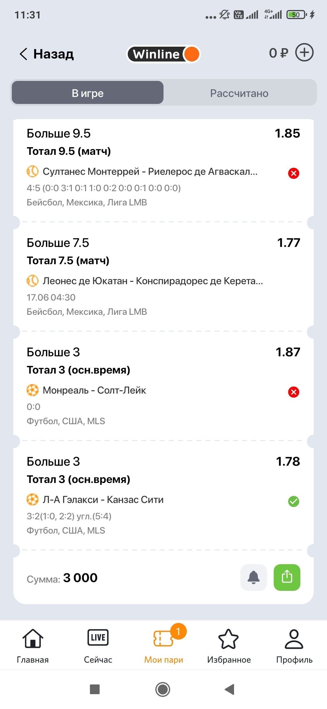 Здравствуйте, ночью стояла система на матчи в бейсболе и футболе. Все матчи сыграли, кроме одного в мексиканском бейсболе. Винлайн, вместо того, чтобы отменить матч и расчитать с коэффициентом 1, перенесли его на 26 часов вперед,тем самым нарушив свой пункт ставок по бейсболу "если матч отменен или прерван и не продолжен в тот же игровой день, то все нерассчитанные пари аннулируются и подлежат расчеты с коэффициентом 1 ". Вместо отмены матча мне его перенесли больше, чем на сутки (с 3:05 16 июня на 4:30 17 июня), тем самым нарушив свой пункт правил по ставкам на бейсбол. Вместо расчета ставки теперь морозят её.