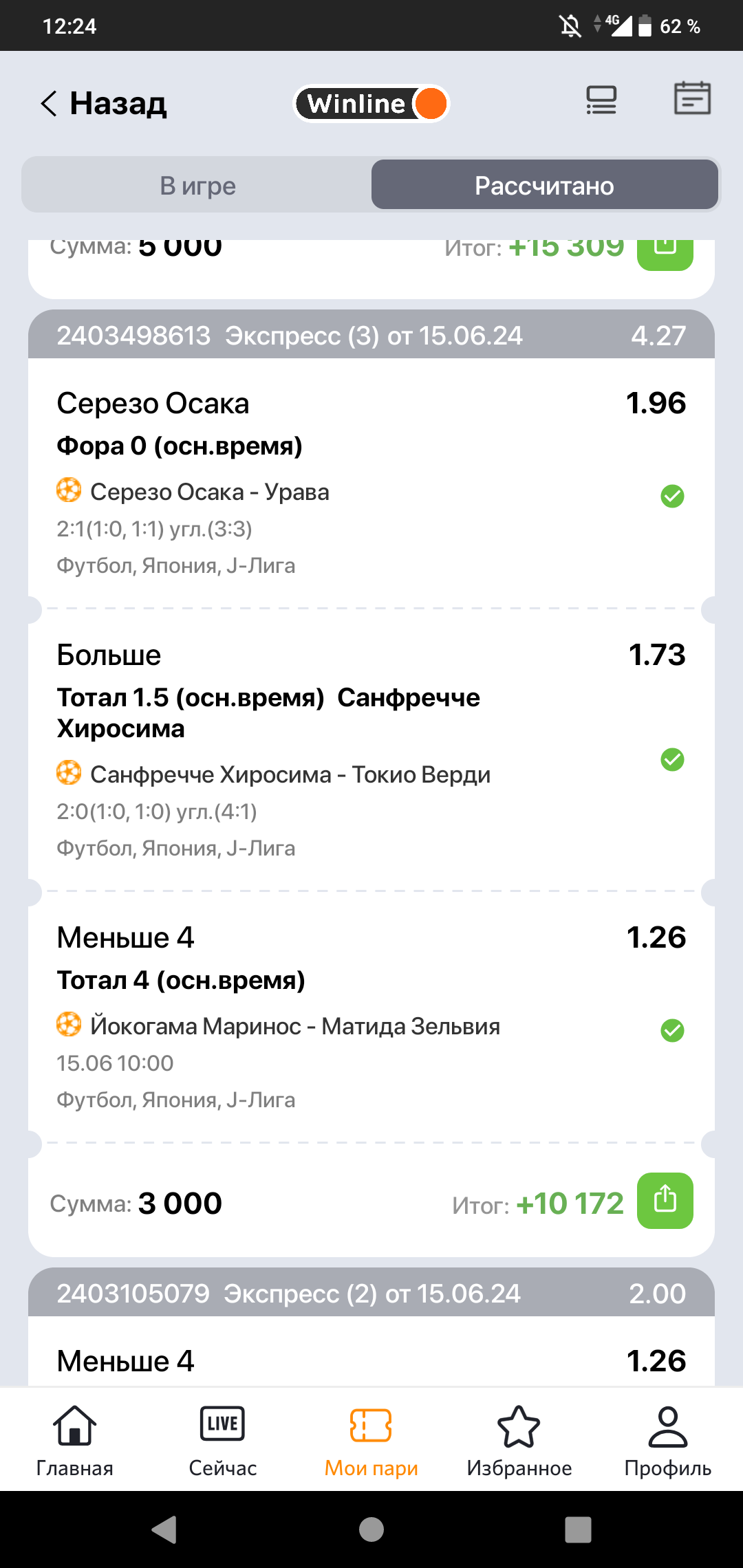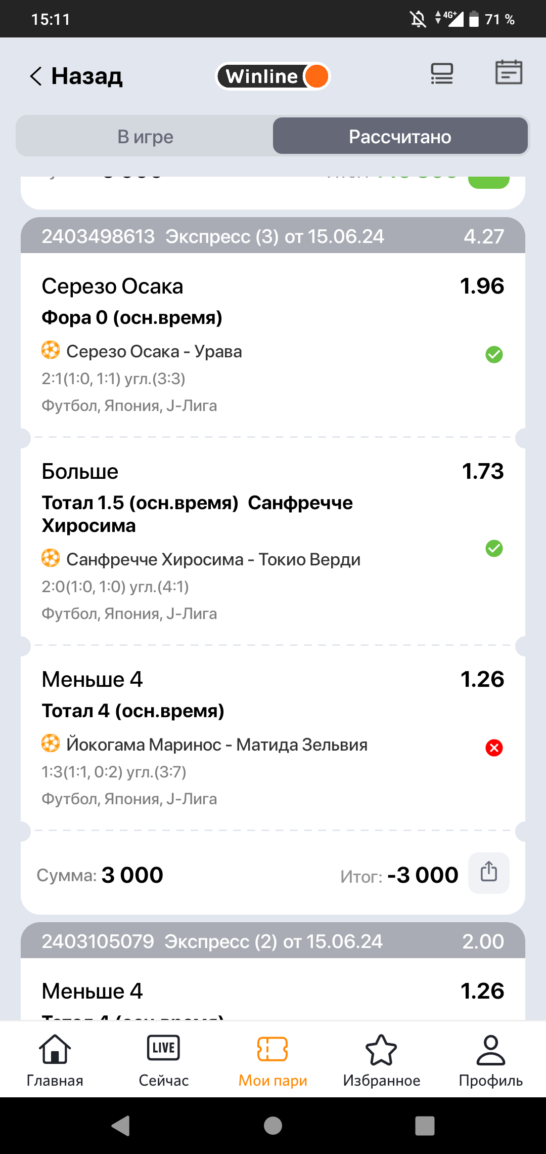 Я следил за матчем в лайве, Йокогама забила второй мяч, соответственно пробился тотал больше 4, но гол отменили после просмотра VAR. Но программа винлайна, скорее всего автоматически засчитала проигрыш ставки, не дождавшись решения VAR. Служба поддержки винлайна не отвечает 3 день .