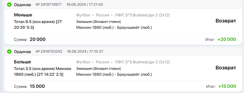Здравствуйте, произошла такая ситуация: проиграл много денег, решил сделать депозит чуть больше и начал ставить на все подряд. Сделал ставку на любительский футбол, после того как зашла ставка, я часть средств успешно вывел, а часть поставил второй раз на этот же матч. Ставка так же успешно сыграла и я вышел с аккаунта. Потом через время захожу, а у меня минусовой баланс и все ставки рассчитаны как возврат. Моему аккаунту уже более двух лет, аккаунт активный, периодически ставлю на настольный теннис и любительский футбол, так что такие ставки не впервые. Но как выиграл сумму чуть больше - сразу БК перестает выплачивать( Прошу помочь разобраться в этой ситуации, так как я ничего не нарушал.