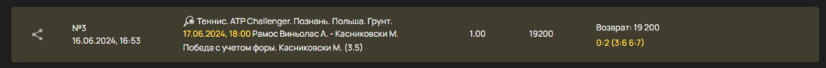 Посчитали ставку 1 к 1. Ставил до начала матча. Заметил только когда зашел в счет и ставка играла и выигрывала уже. , 18:00 Рамос Виньолас А. - Касниковски М.Победа с учетом форы. Касниковски М. (3.5) кэф был 1,76 насколько я помню. Сначала пересчитали по пункту правил . который вообще относиться к футболу, потом во время матча пишу им в чат, ответ прислали только после матча, видимо ждали как закончиться. Теперь пункт правил . про какие-то взломы и опечатки. Не лучше оправдание. В других конторах кэф был 1,5. Поэтому поставил в олимпе поскольку был тут выше. На грубую опечатку уж совсем не тянет, просто был кэф повыше чем у других но не критично. Прошу пересчитать тогда по рынку, как было у других букмекеров
