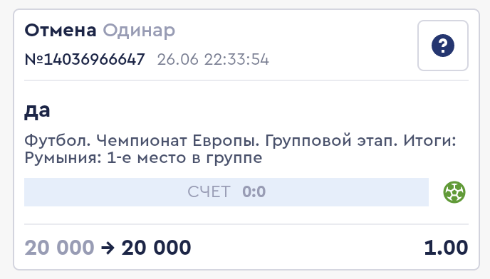 Всем доброго времени суток, огромная просьба помочь с этим беспределом.Ставил в лайве на проходящий ЧЕ по футболу. Одновременно шло 2 финальных матча группы E. Я поставил 20000 рублей на победу Румынии в группе с коэффициентом 11. Для успешного захода ставки мне требовалась ничья в матче Украина - Бельгия и не проигрыш Румынии словакам. Естественно я мог поставить это экспрессом и даже вначале собрал экспресс такой тоже с немаленьким кэфом, но потом увидел вкладку "турнир", где можно было сразу поставить на то что Румыния займет первое место в группе с чуть большим коэффициентом. Я подумал, что тут просто благодаря тому что это не экспресс, а одиночная ставка и нет перемножения маржи - коэффициент больше и решил взять это одной ставкой. Матчи сыграли как надо, но ставку мне рассчитали отменой ссылаясь на ошибку персонала, хотя уверен, если бы Румыны 1 место бы не заняли - они бы не задумываясь рассчитали бы ставку минусом. В любом случае, объяснить как регламентируется ошибка и почему тогда все зашедшие ставки не отменять ссылаясь на их ошибки, мне не смогли и решили даже не пытаться, лишив меня честно заработанного выигрыша в 200к рублей. Если вы считаете что в данной одиночной ставке допущена ошибка - тогда, как олимп тот же, пересчитайте на правильный кэф (который был бы в экспрессе), а не обнуляйте ставки полностью. Я понимаю когда допускают ошибки в каких-то второсортных лигах или статистике, и обнуляют ставки, но тут ЧЕМПИОНАТ ЕВРОПЫ ПО ФУТБОЛУ!!!!!!! Помогите пожалуйста, это беспредел!!!!!