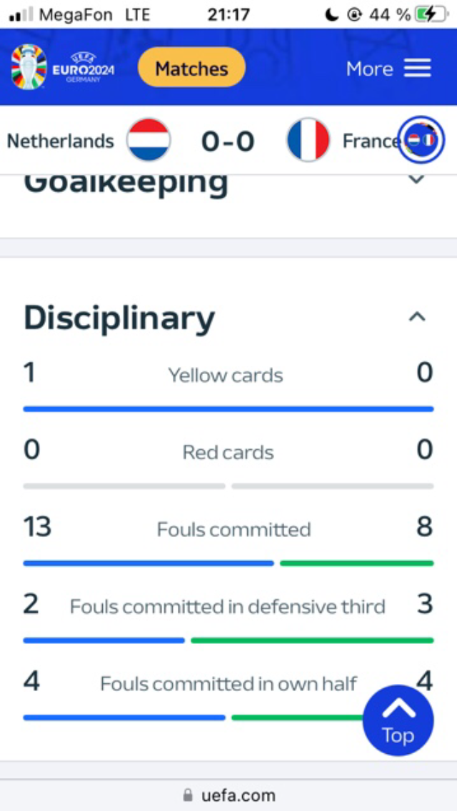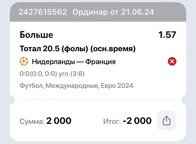 Некорректно рассчитали пари Нидерланды - Франция Тотал 20,5 (фолы) больше. Winline засчитал ставку проигранной. Когда на официальном сайте уефа в протоколе указано что за матч произошло 21 нарушение. Через тех.поддержку ничего не получилось, везде бот, на оператора не подключится. Просьба пересчитать данную ставку.