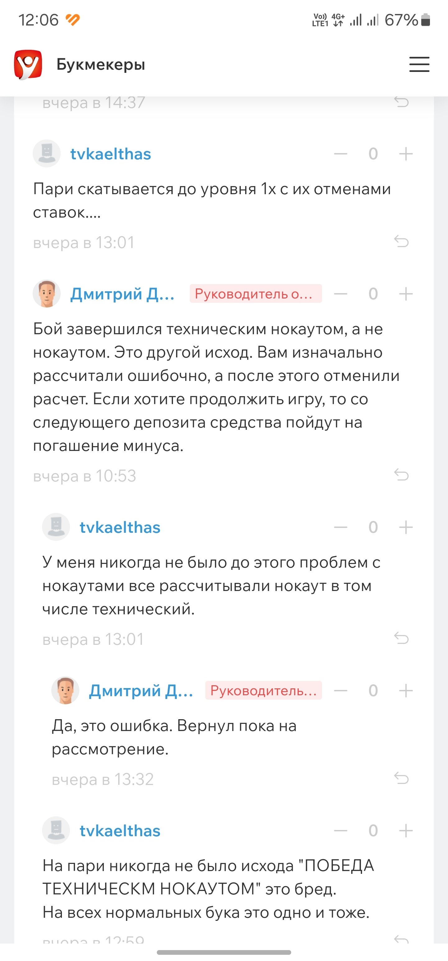 Я зарегистрирован в букмекерской конторе "PARI" и недоволен отменой моей ставки №14123646863 и её последующим перерасчётом. Ставка на победу Лоренца Ларкина нокаутом сначала была рассчитана и выигрыш зачислен, а денежные средства выведены, но позже как сказали в службе поддержки,ставка пересчитана из-за ошибки линии, что привело к отрицательному балансу на счете. Как пользователь, я не могу определить, какие линии ставок являются корректными. Это позволяет букмекеру отменять выигравшие ставки, что подрывает доверие к честности игры. В бою Лоренц Ларкин против Алана Домингеса я поставил на Ларкина, ожидая, что он выиграет нокаутом. Хоть бой мог закончиться иначе и я мог проиграть, я сознательно принял риск, полагаясь на предложенные коэффициенты. Учитывая все факторы, я считаю отмену ставки необоснованной, ведь в случае проигрыша никто бы не вернул ставку.Прошу вас рассмотреть жалобу на данную проблему, предоставить более корректную информацию о том, как определить ошибочная была линия или нет, а так же восстановить мой баланс до состояния перед перерасчетом и аннулировать отрицательный баланс.Увидел жалобу на эту же ситуацию и она была решена в пользу пользователя. считаю что подход к игрокам должен быть одинаковый для всех.