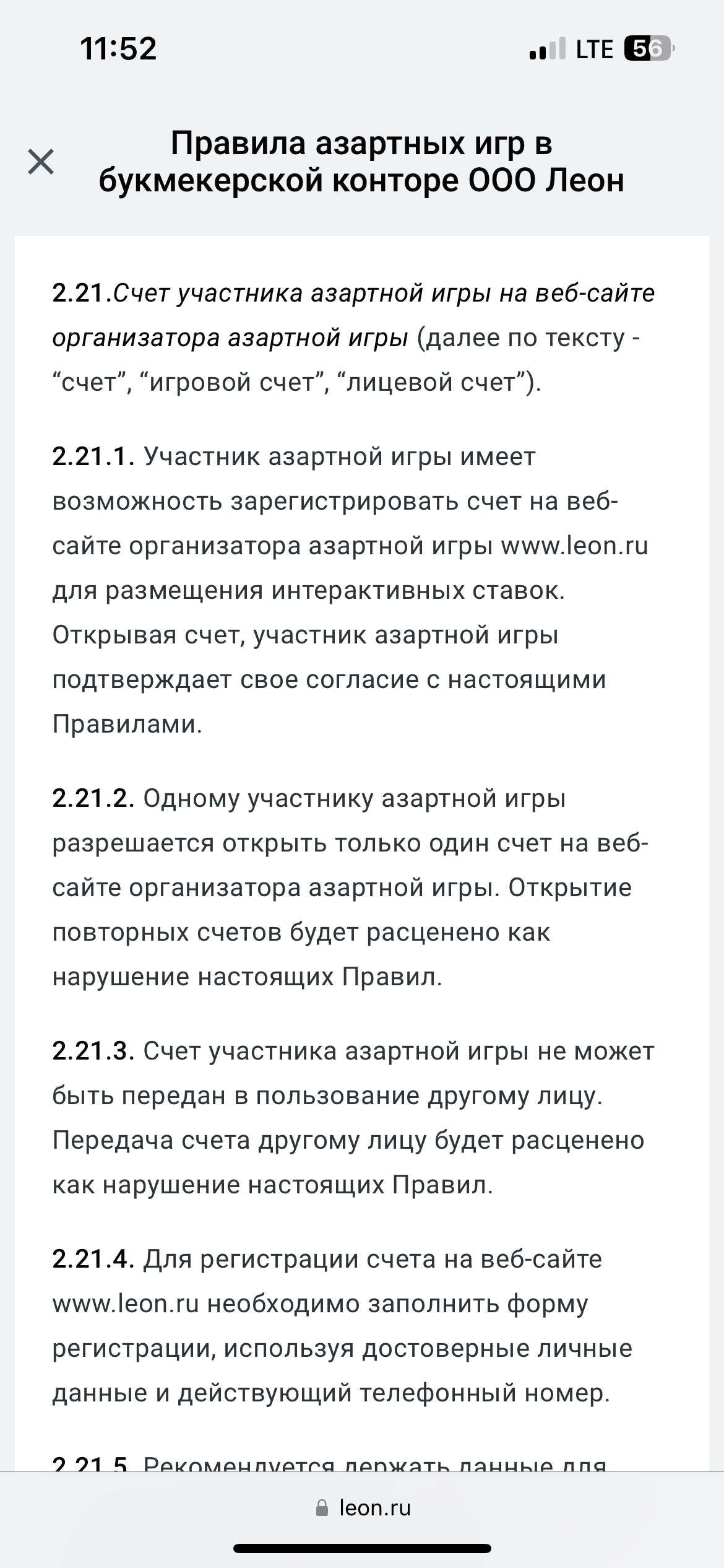 Здравствуйте, первый раз в жизни решила попытать удачу в ставках на спорт, увидела случайно акцию от БК Leon со страхованием ставки на Евро 2024 до 20000 рублей. Зарегистрировалась (счет: 67173921) года и прошла успешно идентификацию, пополнила баланс на 20000 рублей (ID транзакции: 158995966), далее поставила на матч "Румыния-Нидерланды" ставку "Больше 2,5" за 1,81 (Номер пари: 1137580347725208), после окончания матча на счету находилось 36200 рублей. В связи с успешной первой ставкой в моей жизни я решила вывести все деньги со счета и сразу, прежде чем вывести деньги, затребовали верификацию с предоставлением фотографии паспорта и селфи, после этого пришло уведомление, что верификация пройдена, далее спустя 20 минут приходит уведомление о предоставлении фотографии главной и оборотной стороны банковской карты, с которой я пополняла аккаунт, я предоставила фотографию карты, где были четко видна Имя и Фамилия, а на оборотной стороне 6 первых и 4 последних цифр номера карты, но в ответ приходит еще одно уведомление, где нужно предоставить выписку по операциям из банка в формате PDF с указанием так же Фамилии и Имени, номера карты, печати банка и подписи сотрудника банка, либо же любой другой документ с этой информацией от банка, я предоставила! Моментально после этого получаю снова уведомление, где нужно предоставить только выписку по карте с данными, указанными выше, я так же предоставила. После этого прошел где-то час, уведомлений новых не приходило, но сняли 17200 рублей, (ID транзакции - 159374397, тип транзакции - коррекция со счета), и вывод оставшихся средств 19000 рублей был разрешен! После вывода средств, аккаунт сразу был заблокирован без причины, для выяснения причин нужно обратиться в поддержку, но самое интересное, что чат "всегда загружен", операторов нет, только по почте, а там мне указали, что мой аккаунт заблокирован в связи с нарушением пунктов .2. и 11.1. Правил БК, хотя это полная ложь! Это мой первый и единственный аккаунт в любой бк!Я не обязана после выигрыша продолжать играть и делать ставки, я выиграла свое первое пари в жизни, решила вывести деньги, но почему-то контора решила украсть мои деньги, заработанные на моей удаче.Все доказательства прилагаю, к сожалению можно отослать всего 3 фото, есть больше, есть запись экрана со всеми операциями, как чувствовала, что понадобится, так как не могу обычному человеку, первый раз который зарегистрировался на БК просить столько документов