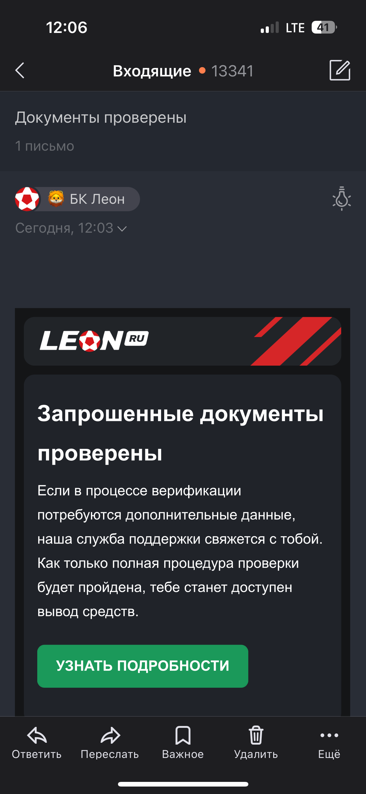 По информации от букмекера, верификация успешно завершена, вывод средств доступен.