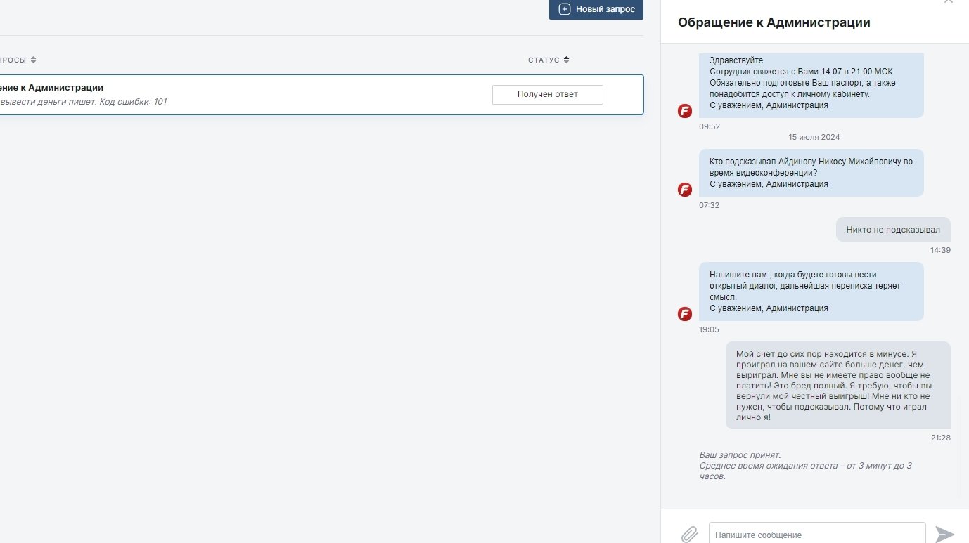 Я играл на фонбете с февраля 2024 года. По началу проиграл примерно 900 000 рублей за первые пол года игры. Потом я немного отбил назад в районе 500 000 рублей. После чего у меня затребовали кучу документов и видео-верификацию. В итоге мне написали, что мне кто-то якобы подсказывал и они конфискуют выигрышь. Я В МИНУСЕ В ЭТО КОНТОРЕ ! Это просто уму не постижимо. Прошу помочь мне решить эту проблему. Если нужно доказательство того, что я до сих пор в минусе я их предоставлю. Просто надо будет делать кучу скриншотов.