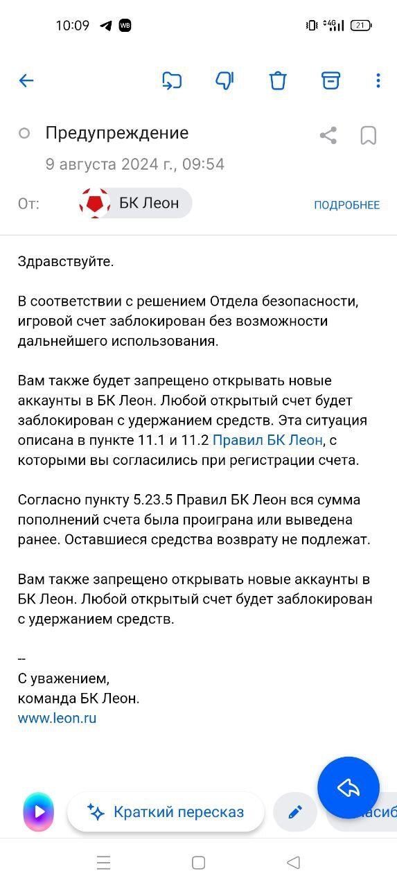 сделал ставку в БК Леон, которая сыграла. При попытке вывода средств на мыло пришло письмо, что мой аккаунт будут проверять 30 дней. До этого все верификации прошел, ни от одной не отказался. Чтобы ускорить процесс, сам предложил видео верификацию, на что получил отказ. Более того, букмекер очистил историю транзакций и ставок. Для чего, понятно, но остались скриншоты. Написал жалобу в СРО БК Леон, но в ответ тишина. Аккаунт 1, привязанный к Единому ЦУПИС. Считаю данные действия незаконным удержанием моих средств и прошу разобраться в ситуации. Скриншоты всей вышеописанной ситуации прилагаю.