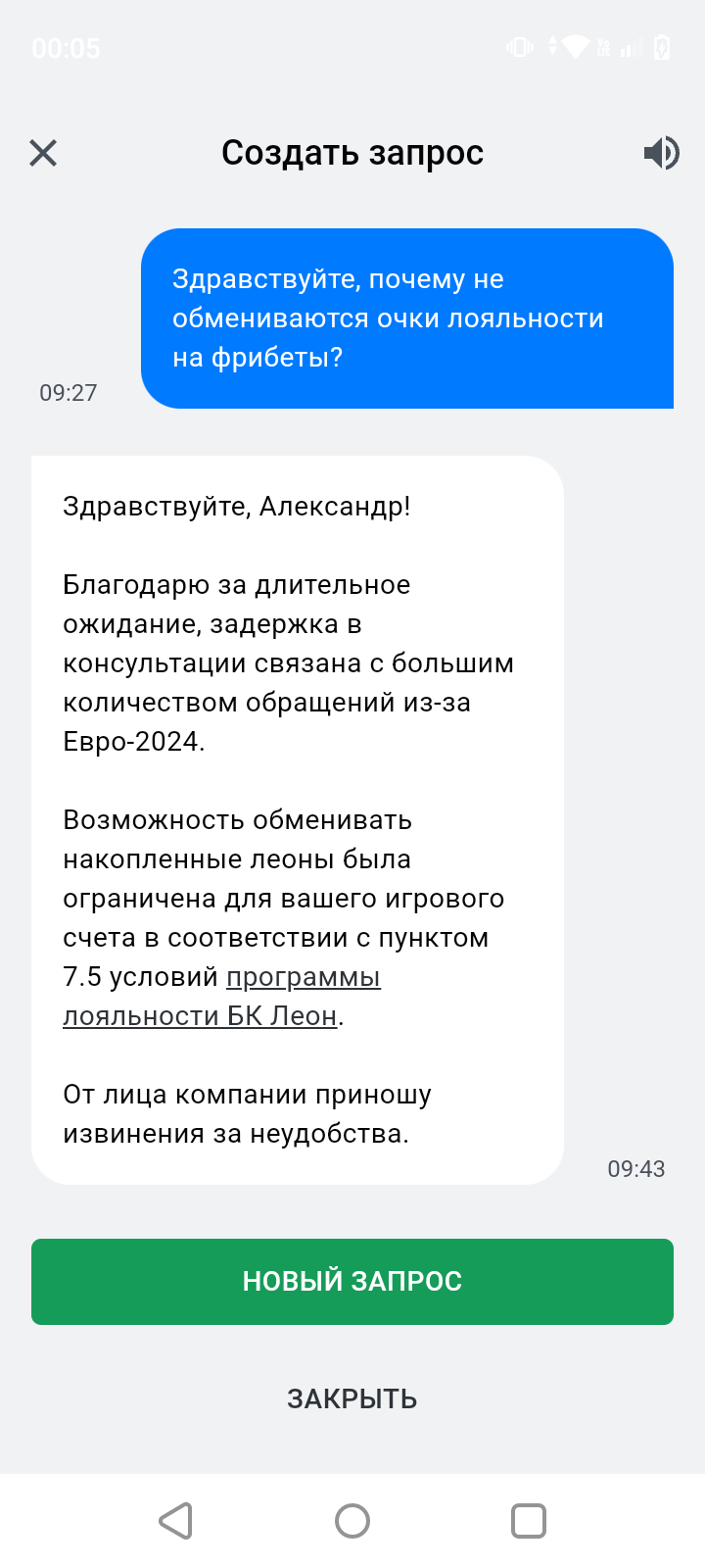 Получил фрибет во время евро-2024, отиграл, вышел в хороший плюс, прошел верификацию, но в итоге все деньги проиграл, но накопил больше 7000 очков лояльности, а бк взял и закрыл мне их обмен, ссылаясь на пункт правил. Я ничего не нарушал, ставил на удачу.
