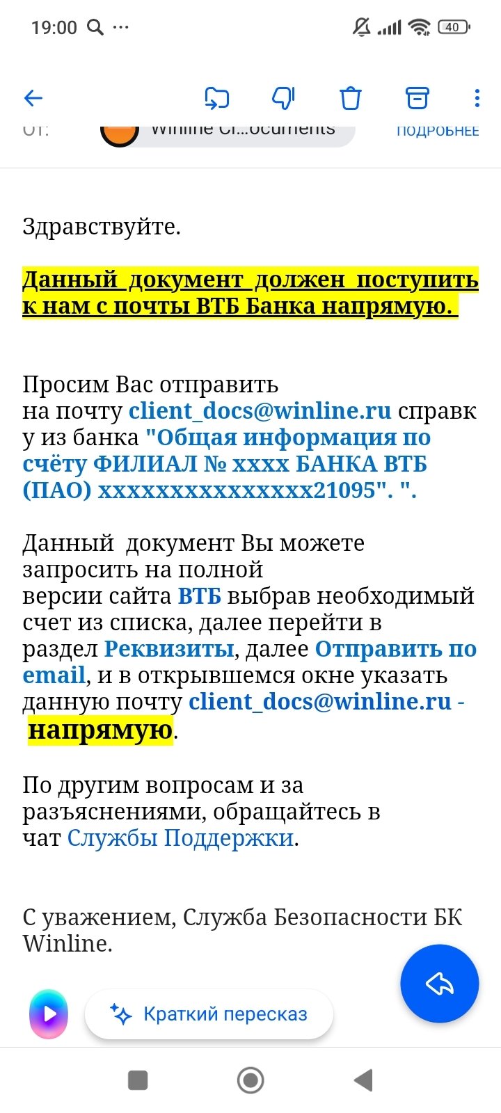 14 июля 2024 выиграла деньги на Винтайне поставила на вывод, они через 3 дня сказали пройти полную верификацию прошла. Потом поставила снова на вывод деньги, через 5 дней они вывели их на игральный счет и попросили переставить реквезиты расчетного счета банка им на почту. Они присылают письмо что реквезиты не поступили, звоню им пишу они говорят что реквезиты не поступали. По вашим отзывам я не одна не могу вывести деньги, по такой же проблеме.