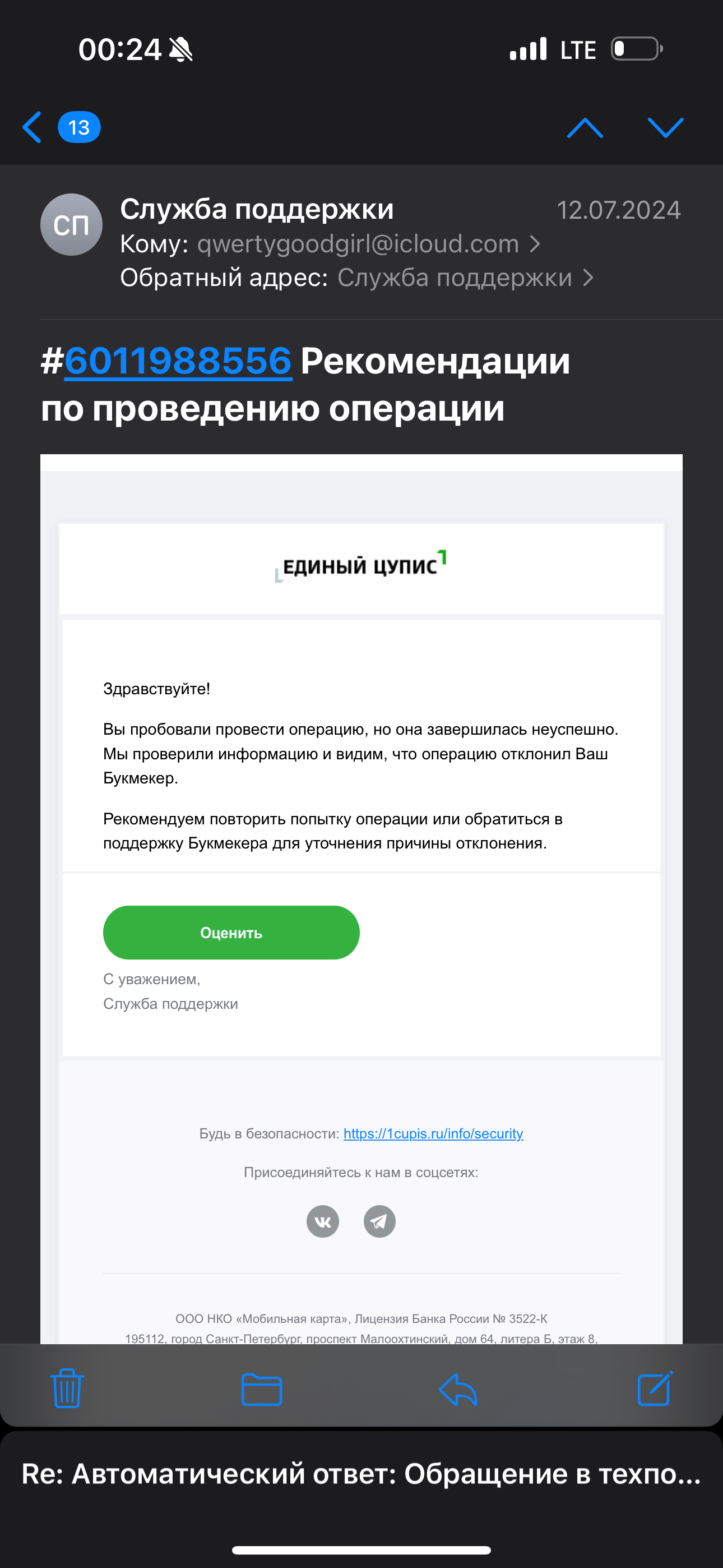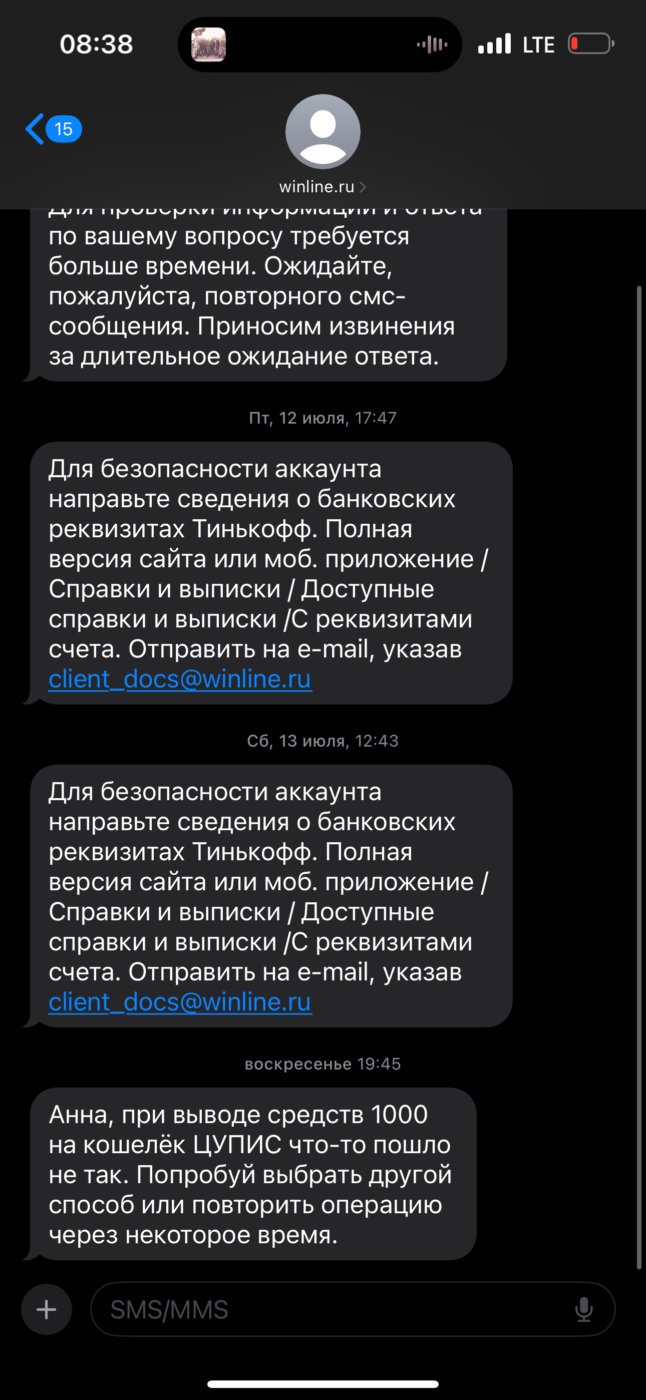 Пытаюсь вывести деньги со своего счета уже пол года. Не могу вывести даже свои деньги, которыми я пополняла баланс!!!Я прошла все возможные верификацииОтправила все селфи и все документы, которые только можно придуматьВ поддержку невозможно дозвониться, а если и удается то каждый раз они придумывают разные ответы, которые не соответствуют действительности!Вывод денежных средств сказали ждать 10 рабочих дней, после этого как обычно поддержка ЦУПИС пишет на почту письмо о том, что операцию отклонил букмекер. Winline даже письмо не удосужатся написать. В чате поддержки бот, если пишешь на почту, то предлагают писать письмо в Москву Сейчас вот при выводе денежных средств пишут ошибка 39 и ошибка 40 Технические ошибки, которые «скоро очень скоро устранят» вообще нет желания играть в Winline детский сад