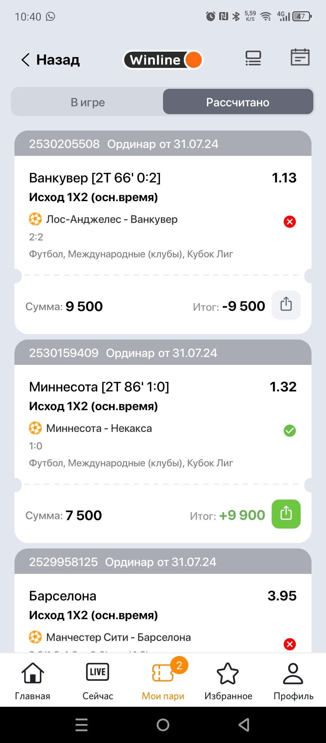 Здравствуйте 👋 сегодня сделал ставку на лосанджелес ванкувер на победу Ванкувера , был счет 2:0 в пользу Ванкувера, после 90 минуты счет сравняли и мое пари сыграло я вывел деньги 💷 потом зашел в приложение и у меня баланс -10000Потом позвонил в поддержку мне сказали что менеджер сначала посчитал что мои пари зашло, а потом пересчитал что нет Так это же не моя вина и теперь пока не покрою -10000 тысяч играть не смогу . повторяю вина в этом не моя.