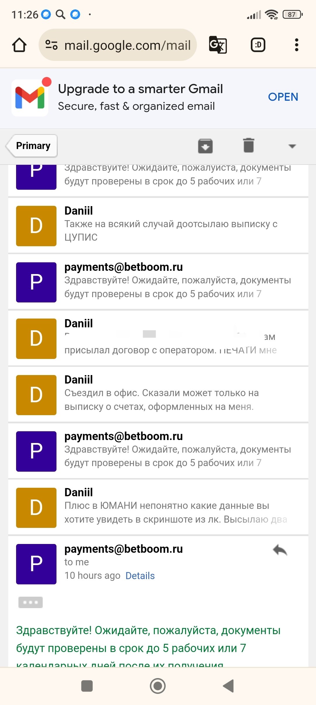Так понял, БК будет затягивать сроки проверки, постоянно кидая меня на обновление документов... Даже не смотря на то, что раннее должны были позвонить.