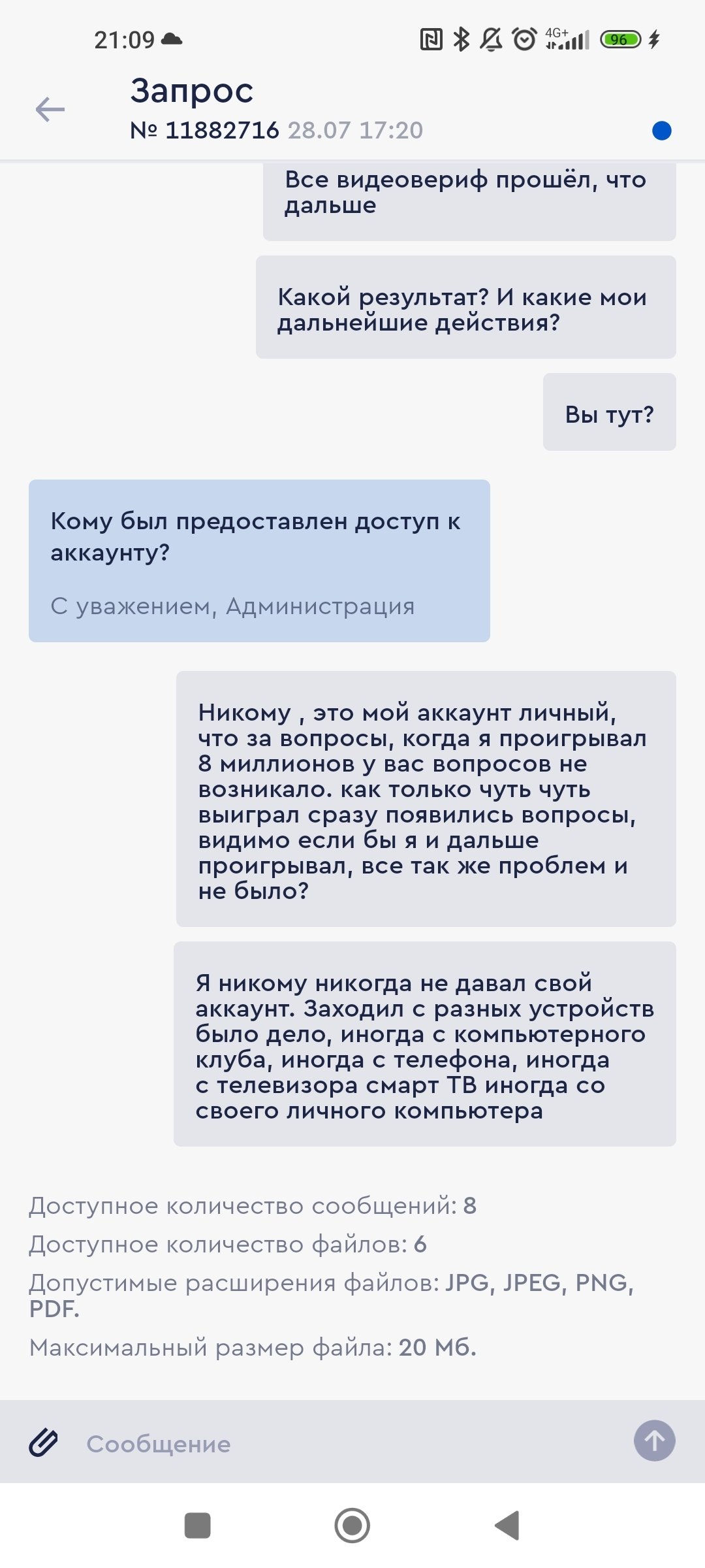 И так начнем по порядку за полтора года слил около 10 млн. После чего решил делать ставки на ЮФС, хочется сказать, что ставки до этого я делал на все подряд на все виды спорта. И вот я выиграл парк сотен тысяч и даже близко не отбил свой минус за все время. Но БК посчитали, что я где то не честен, как интересно получается сливаешь 10 млн (все норм) выиграл чуть чуть ( вы мошенник давайте верификацию. Ну я промолчу про эти классные сроки по 3 дня ждите наших ответов, это бог с ним, еле еле душа в теле прохожу видеовериф. И как вы думаете какой итог? Кому вы давали свой счёт? Говорю никому, я работаю Вахтами и за месяц бываю в 4 городах. Но нет, начинается машна, мало того, что я должен помнить все что ставил в апреле итп. Какая вам разница, что я ставил. У меня в день по 30-40 ставок в БК и не только фон. Но я должен помнить, что я там ставил, сказал +- из раздела единоборства и бокс. Кароче сюр какой то, я уже даже не надеюсь получить ответы. Прошёл видеовермф в 11 , сейчас до сих пор итога нет.