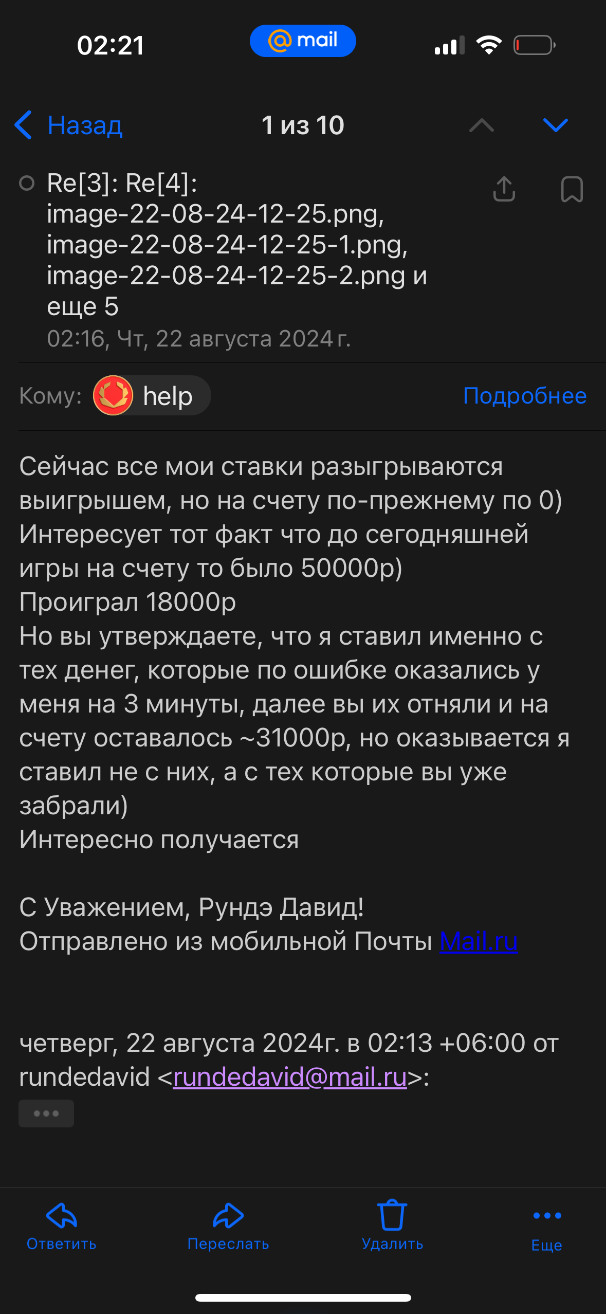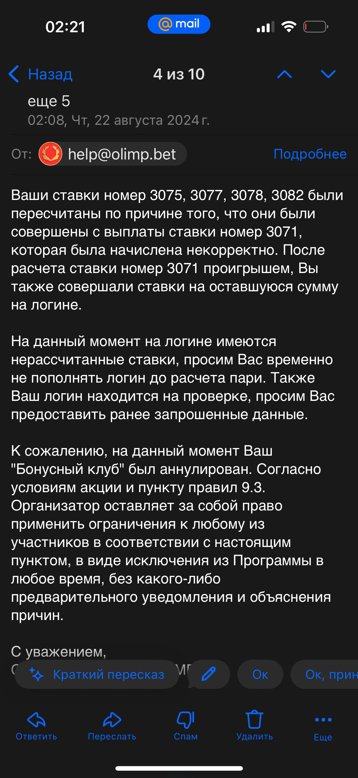 Здравствуйте, текст скопировал с обращения к ним на почту) просто перестали отвечать.Если вкратце, то все выигрышные ставки ушли на возврат, а проигрышные засчиталисьС баланса в 138000, просто оказалось 0, никакого внятного ответа я так и не получил!Хотелось бы связаться со старшим оператором потому что 24 минуты пустого разговора с вашими штатными операторами, решению вопроса не привели!Вопрос заключается в следующем: вы отменили все мои выигрышные ставки. «К сожалению, букмекер вправе это делать»- так сказала девушка оператор.Если рассмотреть ставку #3023 и #3024 то просто не ясно в чем причина, как говорит девушка , то не корректный коэффициент, а как такое может быть?) столько не корректных коэффициентов🤔 или же рассмотреть ставку #3071 то там в принципе все корректно) как она сказала. Соответственно, хотелось бы знать вернуться мои деньги или нет? Или в вашей букмекерской конторе разрешено только проигрывать?При возможности, хотелось бы получить от вас звонок (только не от штатного сотрудника, который разговаривает как робот, заученными фразами и добавляя «к сожалению»)Все скриншоты приложены!На счету до всех ваших отмен находилось 138 тысяч рублей (с небольшим)Сегодняшний день начинался с 50 тысяч рублей, и вы посчитали вчерашний мой день тоже некорректным, и отменили ставки за 20 число!Надеюсь чего-то добиться от вас!