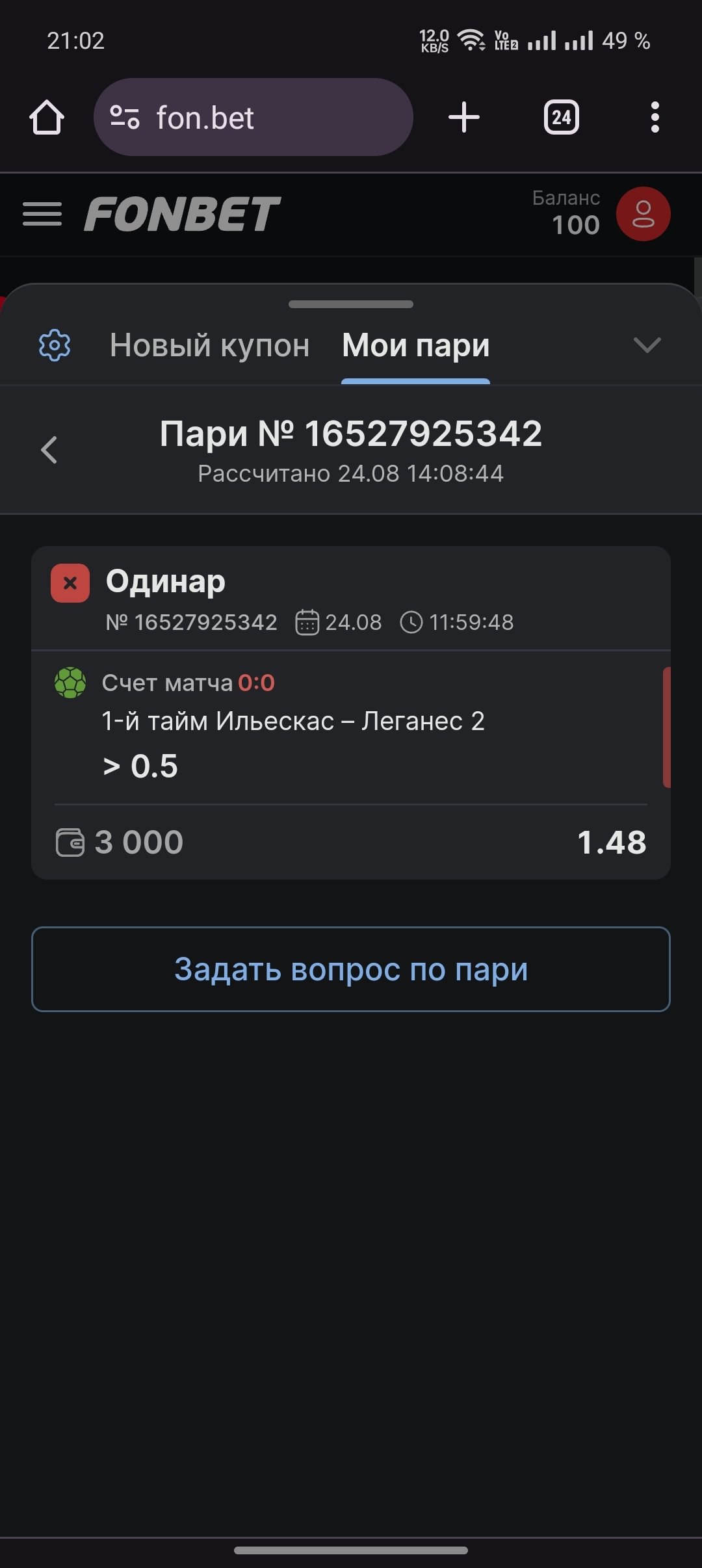 Матч Ильескас- Леганес 2 так и не показывался на площадке, нашел информацию что матч был отменён, БК решил не отменять матч, а засчитать поражение по ставке.