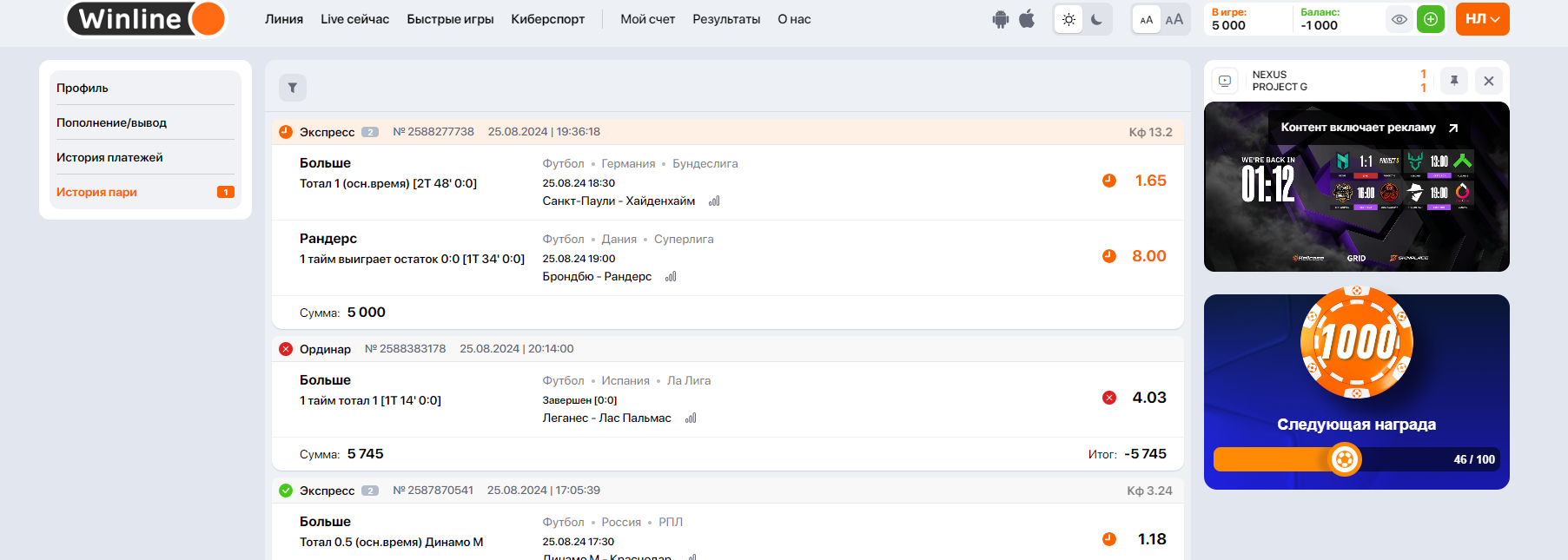 Добрый вечер! Помогите пожалуйста разобраться с проблемой, поставил ставку экспресс из двух событий в лайве (на скрине видно), она выиграла. на баланс пришло чуть больше 70 тысяч рублей. Далее поставил еще ставку и остаток остался 65000 рублей. Поставил на вывод и через час вывод отменился. Начал разбираться и предоставлять документы, в итоге все продлилось до вечера, все что нужно я скинул, а ставку вообще поставили как не рассчитанная, а баланс стал -1000 руб. Из раздела «рассчитано», экспресс ушел в раздел «в игре».Ставил победу в чемпионате Дании на остаток в первом тайме на команду, закончили 0:1И тотал в чемпионате Германии, закончили 0:2.В итоге БК что то не понравилось через несколько часов и решили меня кинуть. Помогите пожалуйста, а то их слоган «Винлайн заплатит без вариантов» — обман получается.Спасибо. Надеюсь поможете!