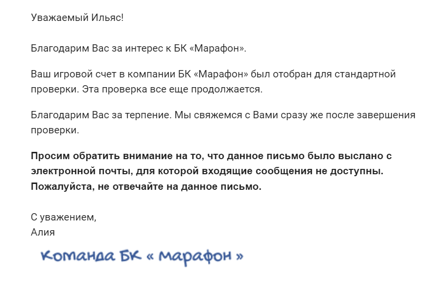 О любых изменениях статуса проверки, а также о возможных действиях, необходимых с Вашей стороны, наши специалисты проинформируют Вас через электронную почту, привязанную к игровому счету. Приносим извинения за неудобства и рассчитываем на Ваше понимание.