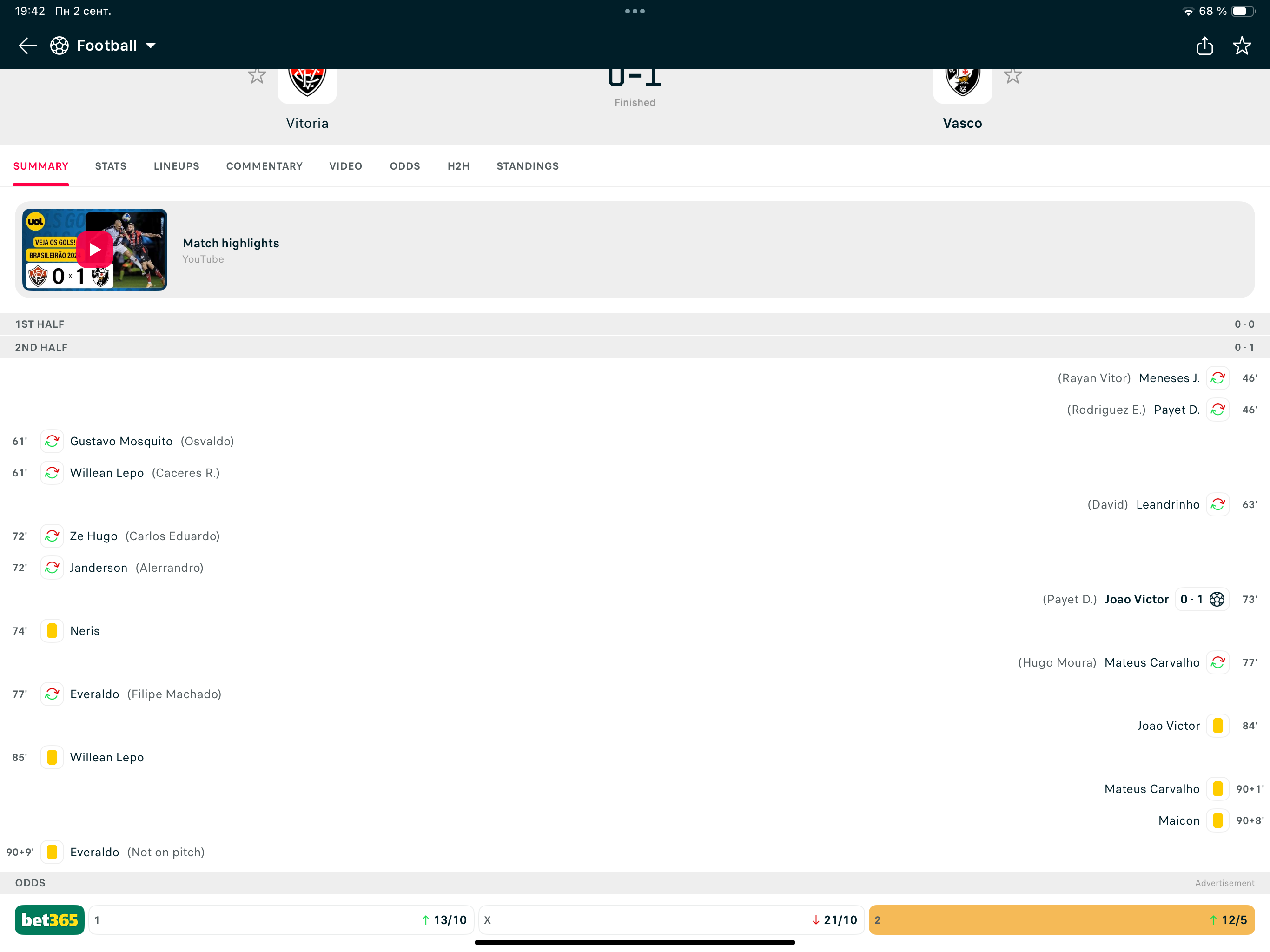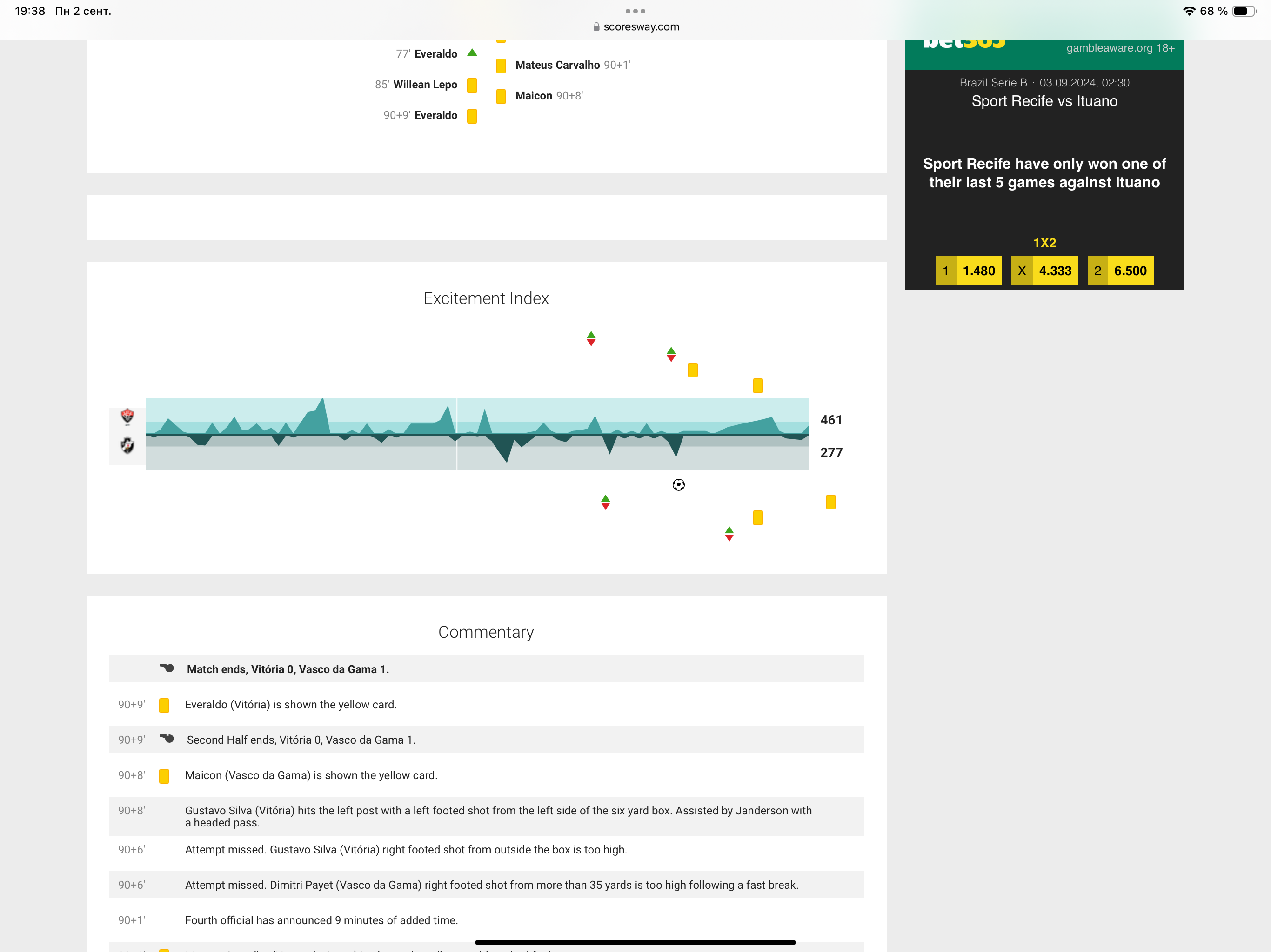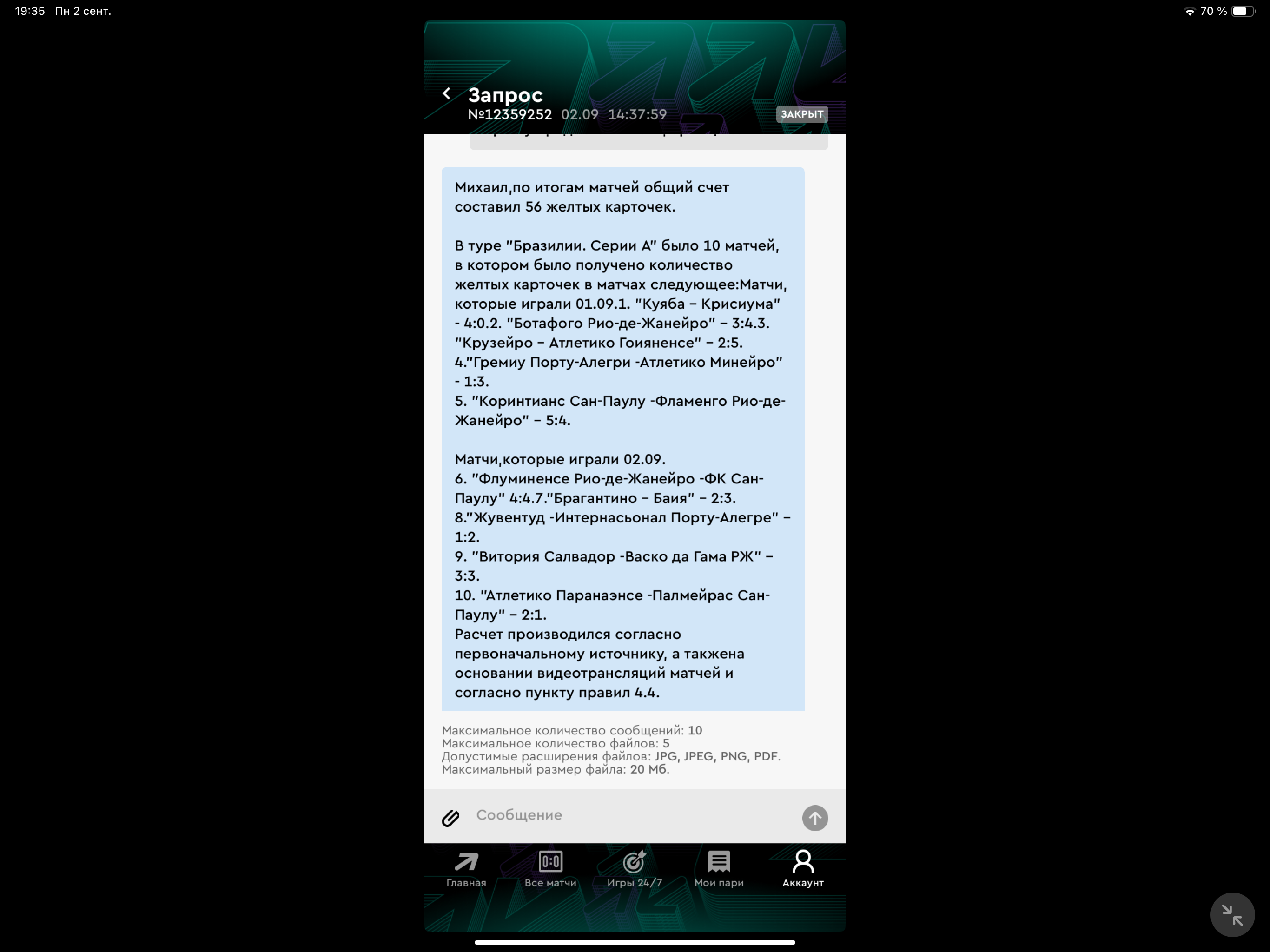 Собственно, мои догадки подтвердились. На скрине ответ от службы поддержки. Итого насчитали 56 жк, вопрос как раз по матчу Витория-Васко да Гама. Пари дает 6 жк в этом матче, по данным всех источников было 5 жк. Желтая Everaldo была показана после финального свистка.