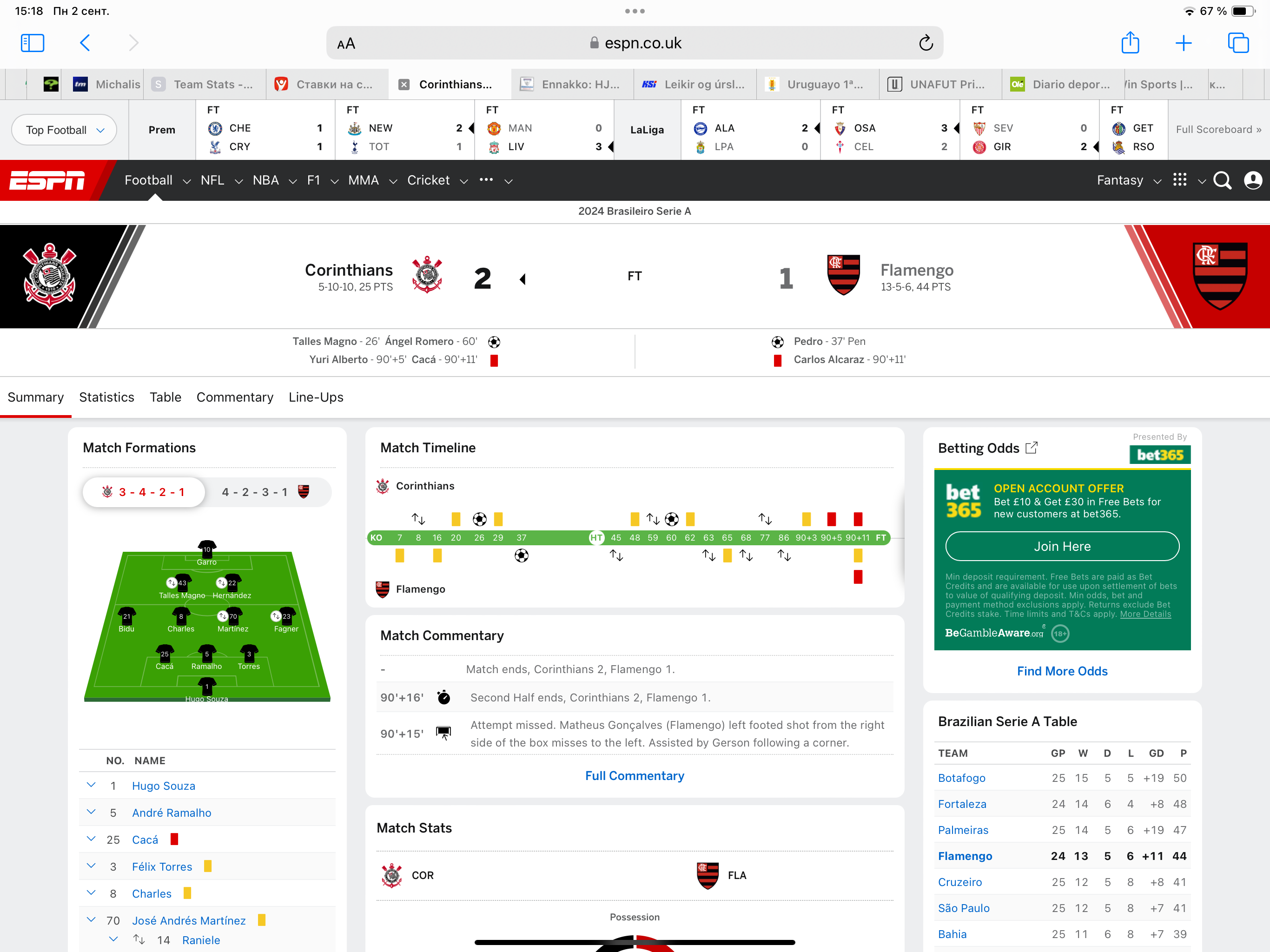 Добрый день. Заключил в данной БК пари на туровую статистику чемпионата Бразилии по футболу желтые карты