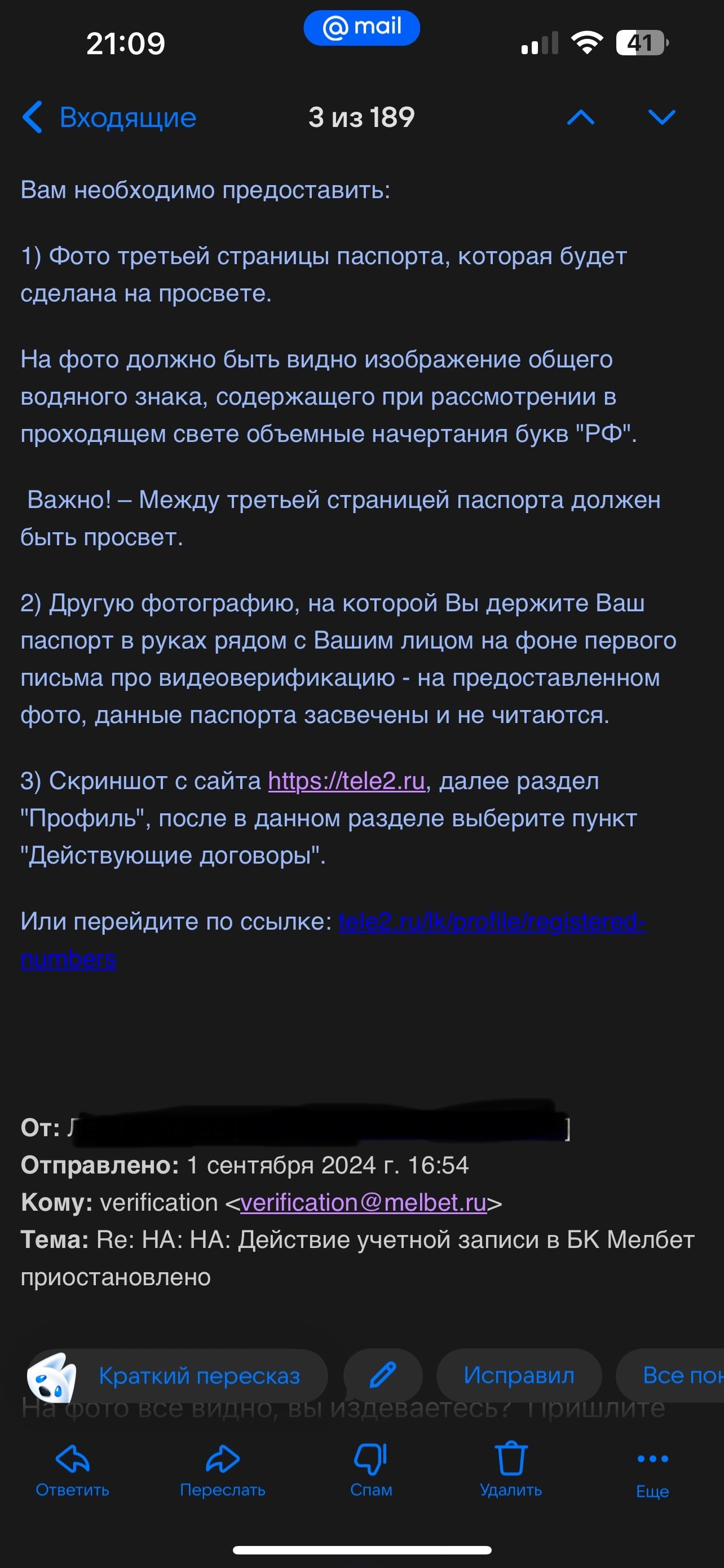 Пользовался Мелбет, по чуть-чуть ставил на то, чего не было у других букмекеров. И все было прекрасно до момента первой попытки вывода денег. Доступ к аккаунту тут-же ограничили и письмо счастья на почту привет. Не смотря на то, что количество документов и требования к ним откровенно возмутительны, несколько раз отправлял запрашиваемые документы, пока не стало понятно, что это простое издевательство. Нормальным букмекерам достаточно регистрации ЦУПИС, номера телефона и почты. Но здесь … заграничный паспорт с визой в другую страну проще получить. А у них по какой-то причине есть легальная возможность работать и кидать людей на деньги!