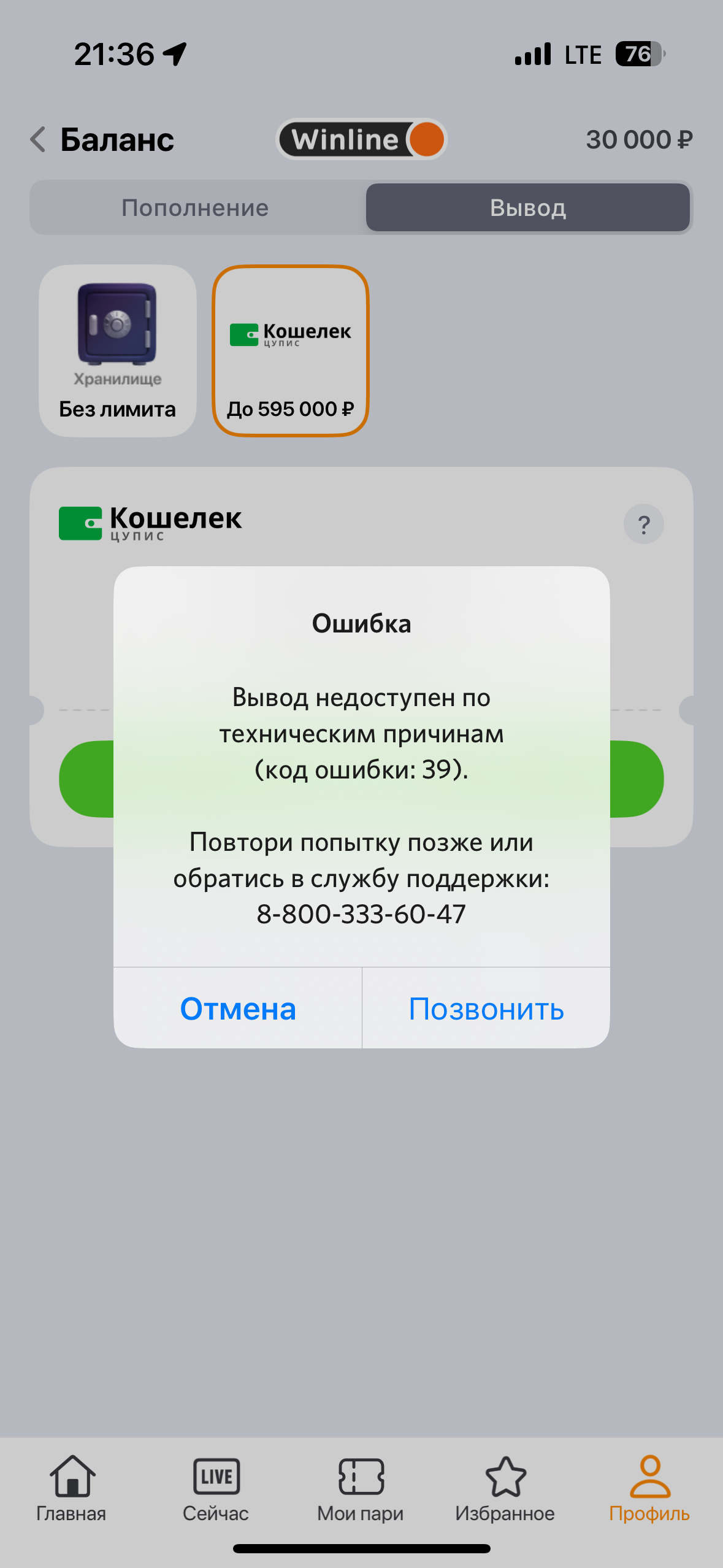 Здравствуйте, приняли, теперь деньги вернулись обратно на баланс и при выводе выдает ошибку 39