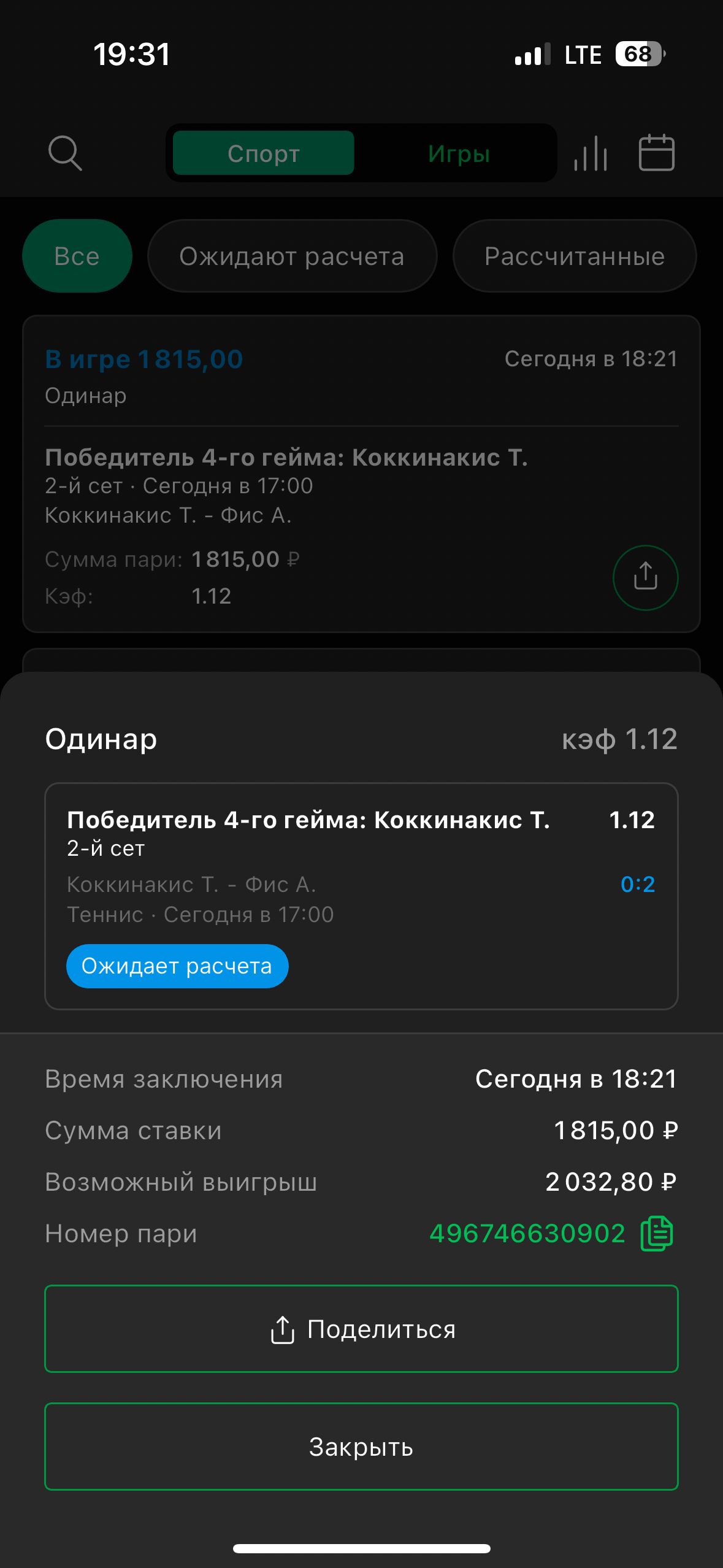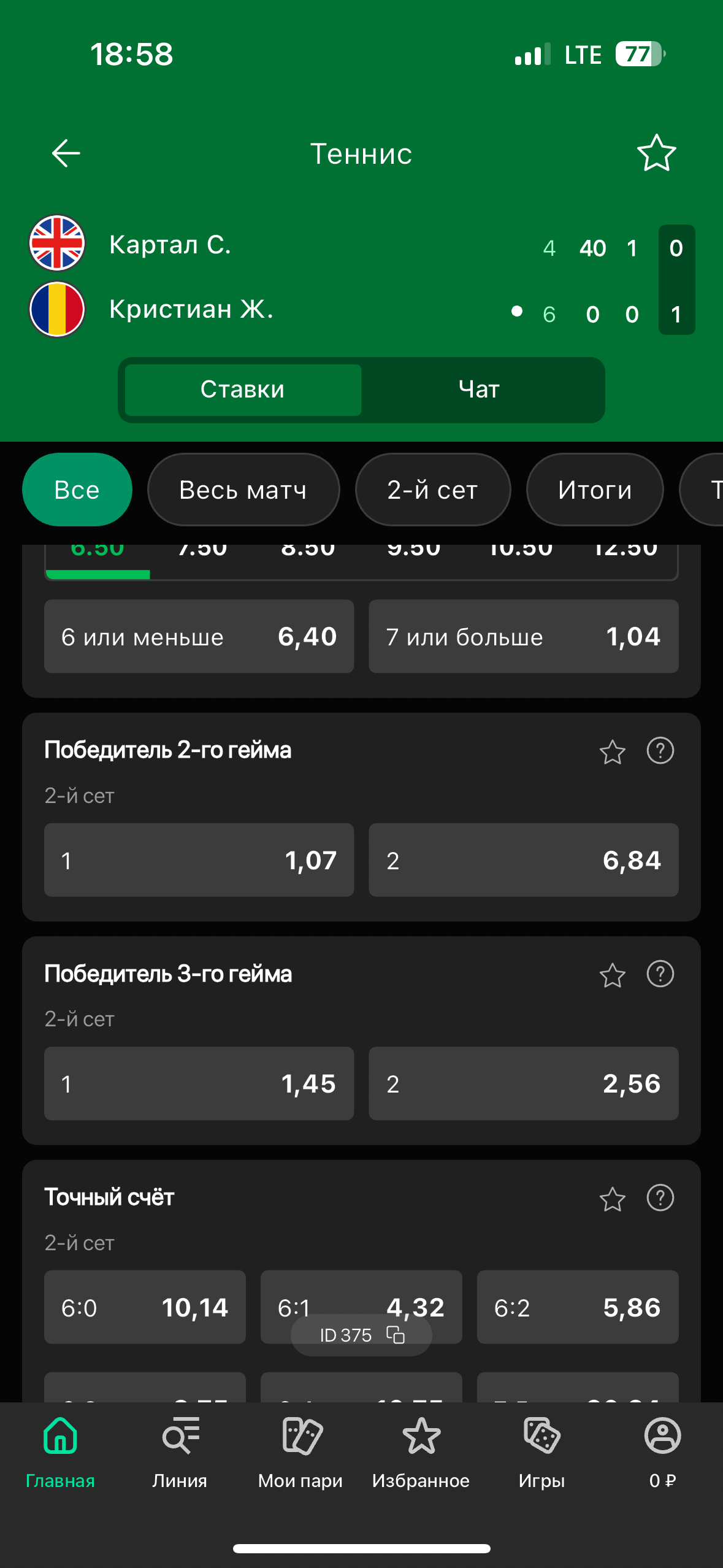 (Такая же жалоба как и 1, забыл добавить скрины) Здравствуйте, мною была сделана ставка на победу в гейме. Ставка была во втором сете, когда он еще не начался. Следив за данным матчем, а точнее за первым сетом у подающих не было проигранных брейк поинтов, в связи с чем котировки на победу в гейме подающего были в районе . (На другого, кто принимал подачу соотвественно гораздо выше). Еще не начался второй сет, и мною была сделана ставка на ПОБЕДИТЕЛЯ 4 ГЕЙМА, что я увидел только потом, потому что совершил уже много таких ставок и никогда не было такого что ставки на победе в гейме принимались бы на 4 гейма вперед (всегда было на 2 гейма, скриншоты ниже). Ладно если еще такое и возможно, точно уверенным быть не могу, но чтобы на неподающего в гейме была ставка просто за гранью, учитывая что весь предыдущий сет они были стабильны. Я уверен что здесь ошибка. Написал в поддержку где первый оператор забрасывал меня шаблонными фразами, после чего я попросил его позвать другого специалиста. На это предложение он отказался. Далее я позвонил на горячую линию, где меня выслушали уже гораздо лучше и создали обращение. Я все объяснил и после того как пришел ответ спустя 2-5 минут, было написано что все котировки верны. Я заходил в другие бк и смотрел котировки там, и везде были кэф на подающего маленькие, а на принимающего больше. Именно после моей ставки данный матч в игре перестал обрабатывать ставки и уже в течении часа прием ставок именно в бк лига ставок не доступен. Еще хочу отметить что когда начался 1 гейм во 2 сете (моя ставка если что была на 4 гейм), котировки моей ставки проходили по событиям в 1 гейме. То есть когда игрок начал проигрывать ставка сильно упала, когда начал выигрывать поднялась.