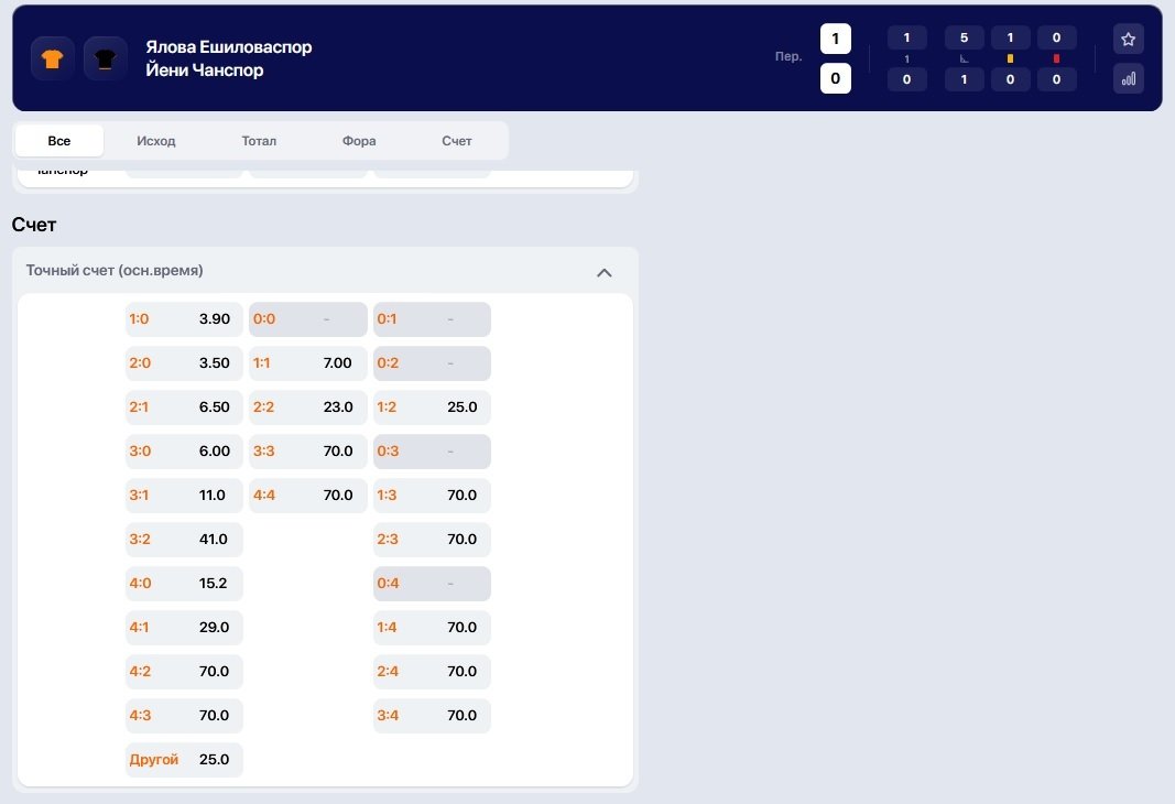 Вот пример, смотрите. В этом матче вариант "другой" сыграет, к примеру при счете 5:0, так как этого счета нет среди перечисленных.