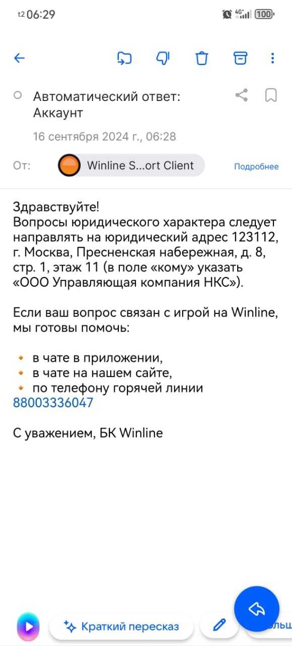 Указанный личный кабинет заблокирован, для получения разъяснений, пожалуйста, обратись на support@winline.ru.